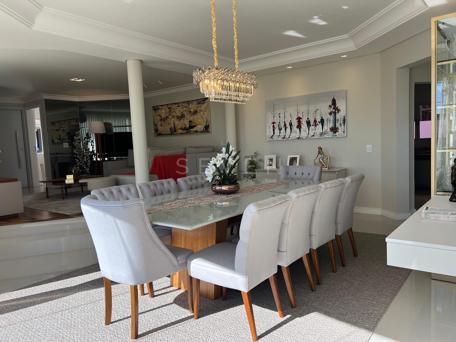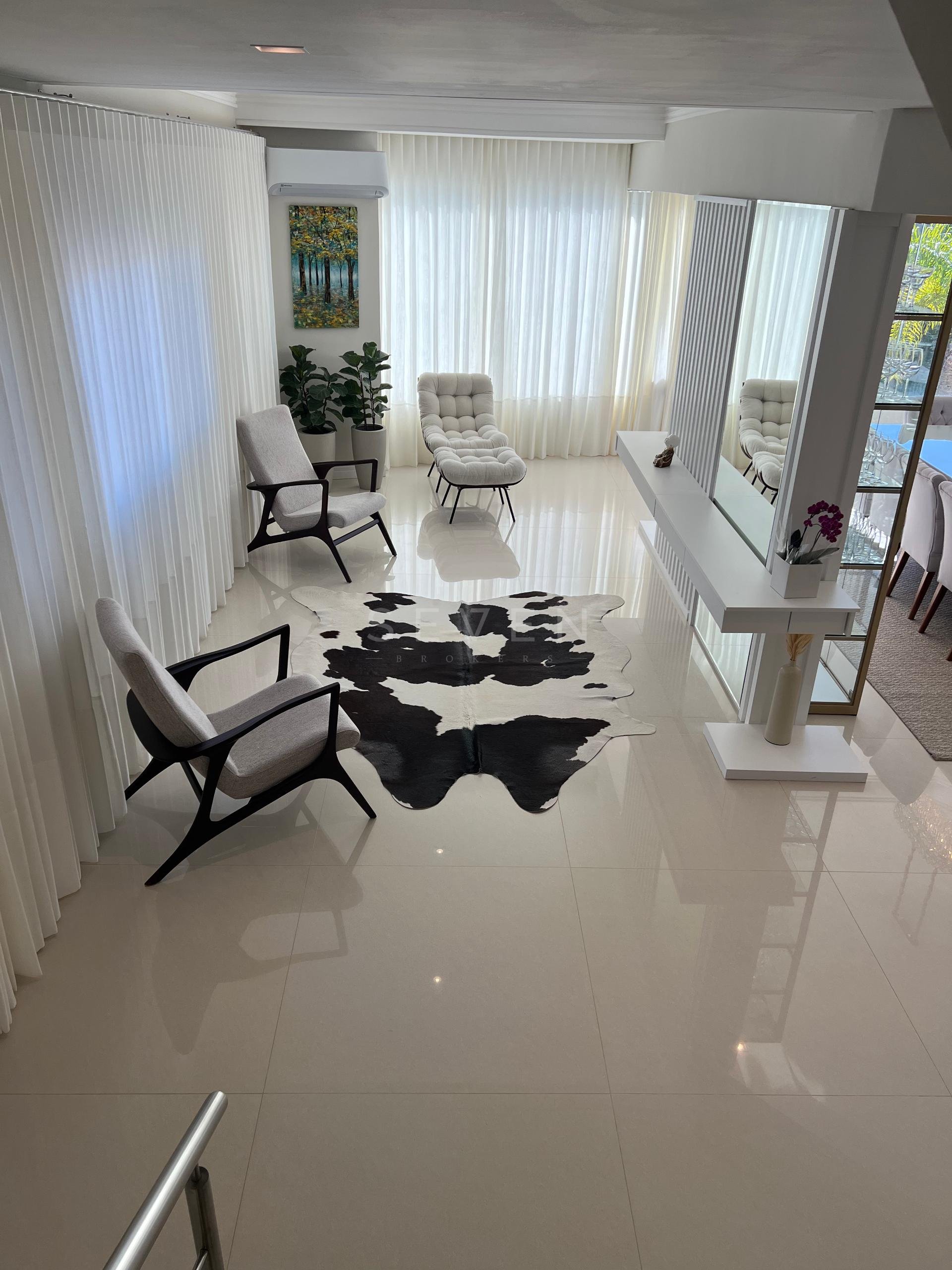 Ao entrar, você é recebido por uma sala espaçosa e ensolarada, ideal para reunir a família com conforto. A charmosa sala de jantar com lareira torna os momentos à mesa ainda mais aconchegantes. O escritório na entrada da casa é um espaço versátil, perfeito para quem trabalha ou estuda em casa. Um lavabo prático completa a área social.