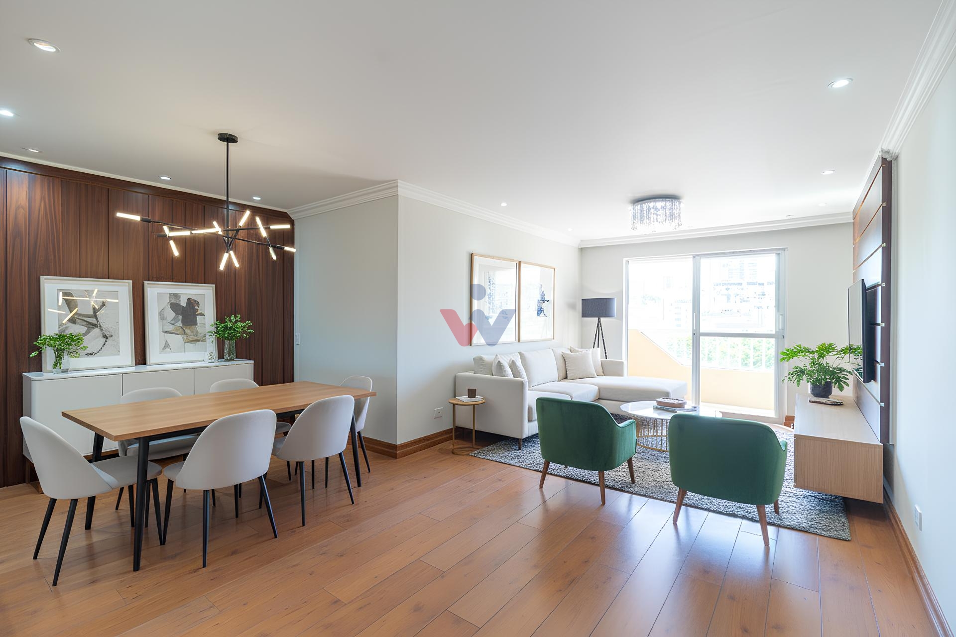 Sala para dois ambientes com painel de TV