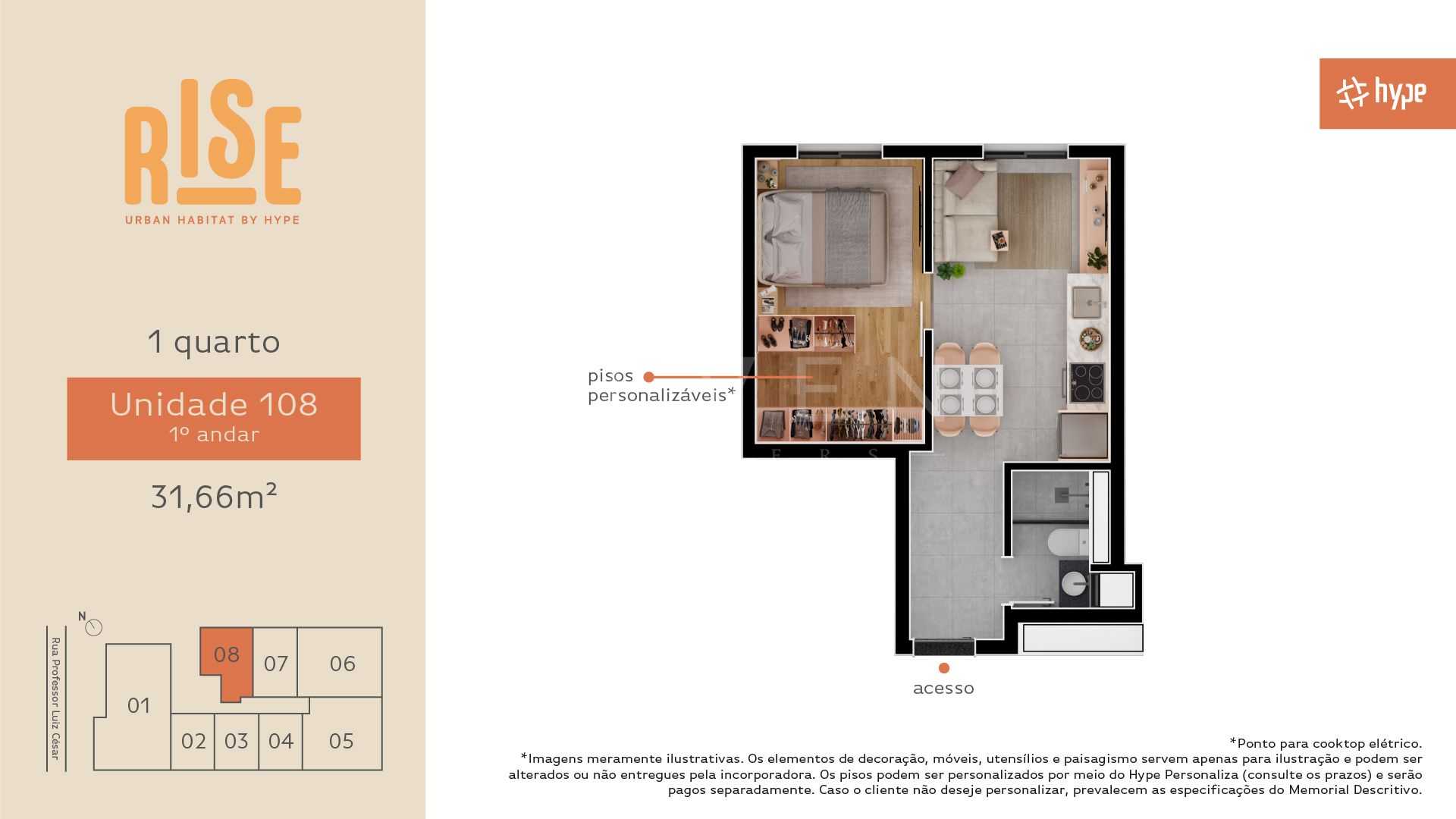 Composto por uma única torre de 6 pavimentos e apenas 30 unidades, o Rise Urban Habitat é sinônimo de exclusividade. São oito tipologias de plantas cuidadosamente projetadas para atender diferentes estilos de vida: studios, lofts duplex, apartamentos de 1 quarto, e opções de 2 e 3 quartos com suíte. As metragens variam de 28,75 m² a 84,23 m² privativos, oferecendo desde layouts compactos e funcionais até espaços amplos e sofisticados.