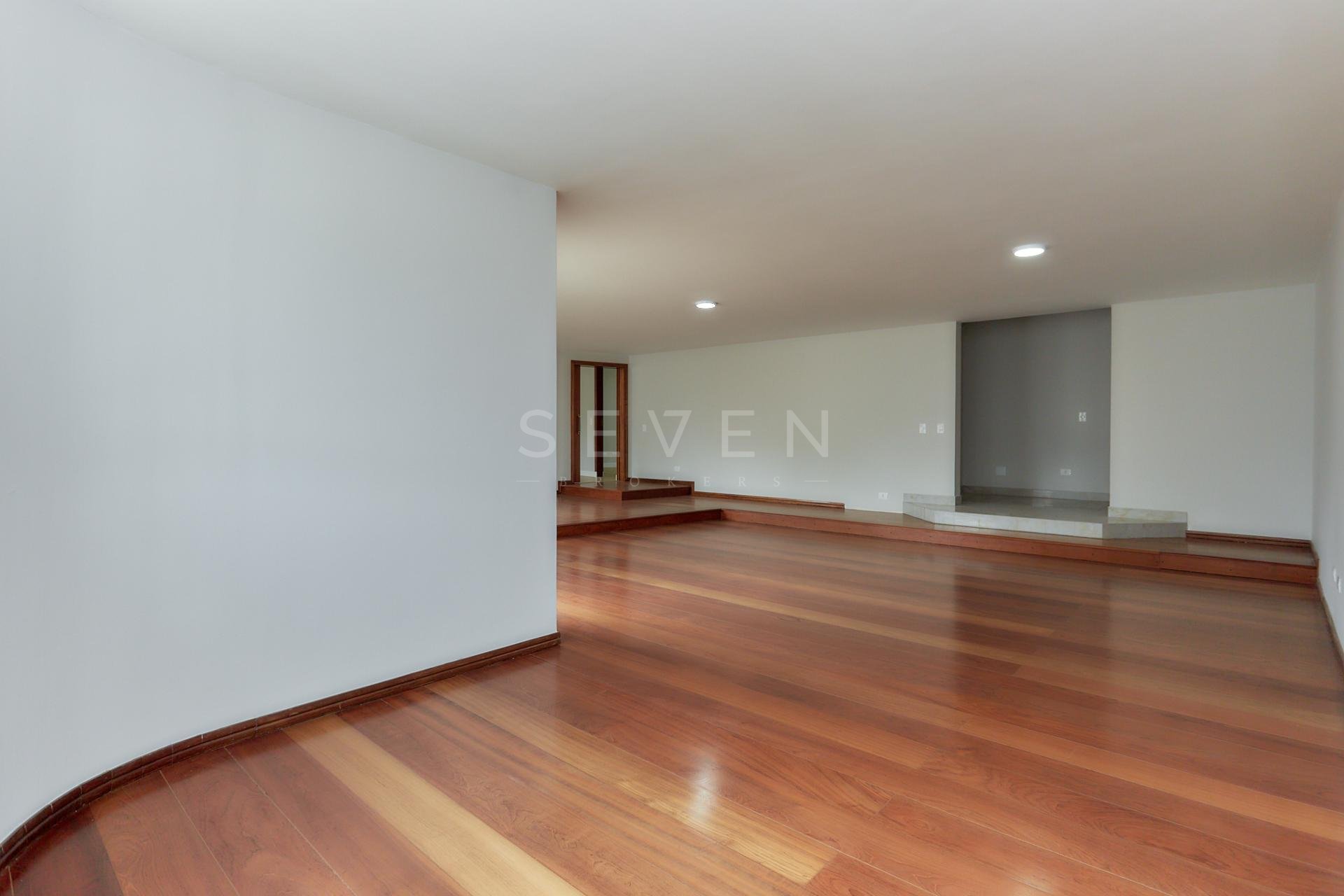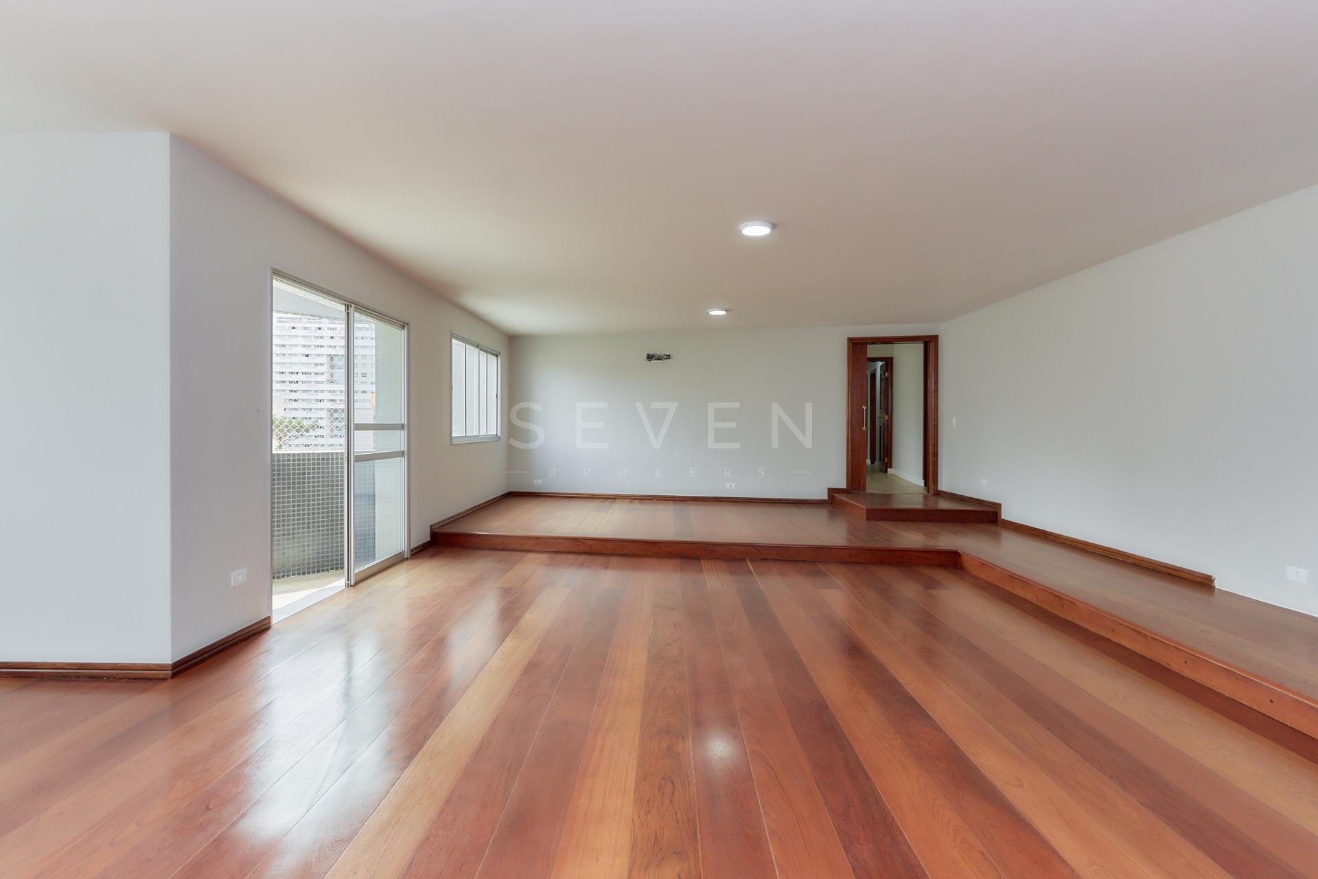 Sala ampla com 4 ambientes em desnível, piso de madeira e sacada com vista definida;