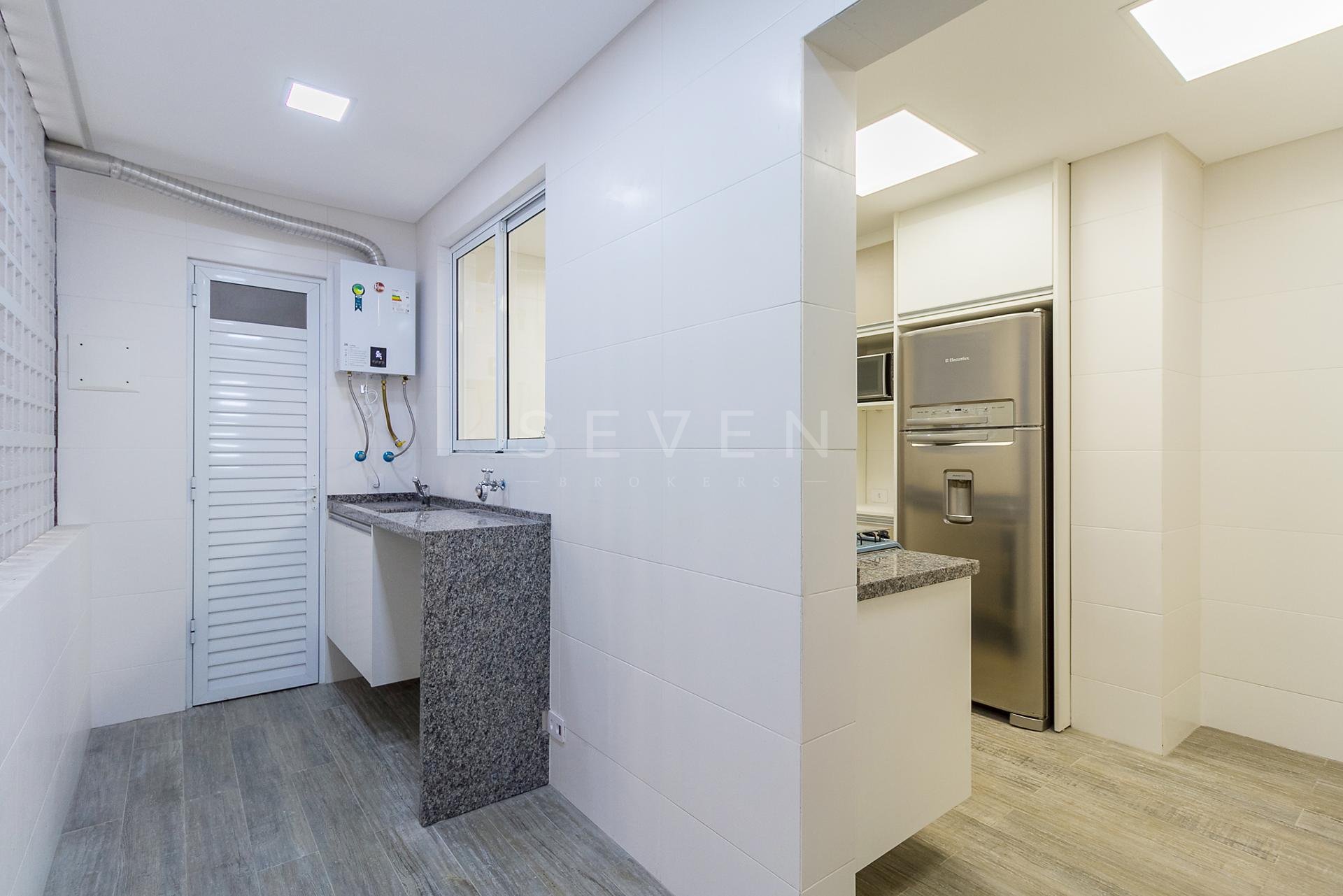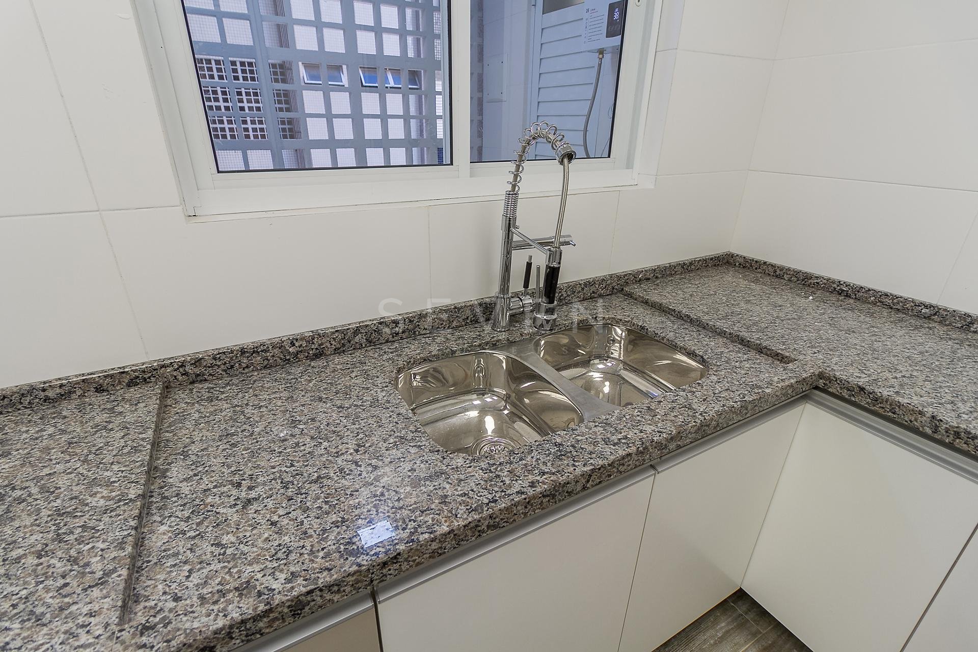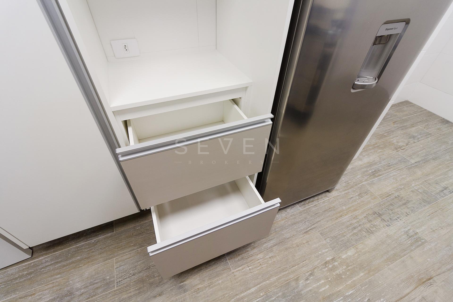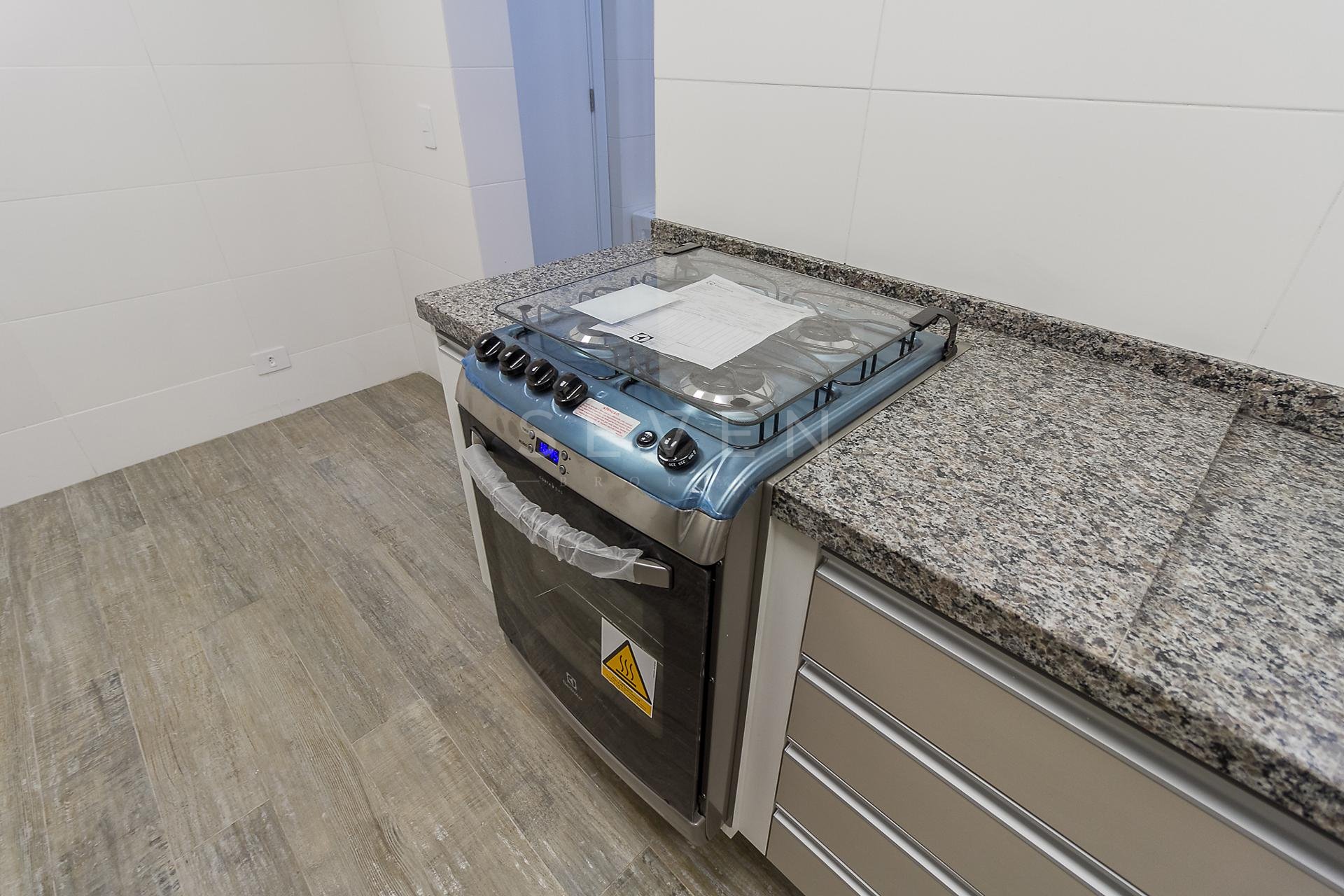 Com 101,42 m² de área privativa, o imóvel é bem ventilado e iluminado. Possui três quartos, sendo uma suíte com armários planejados, além de sala integrada, lavabo e cozinha equipada com armários.