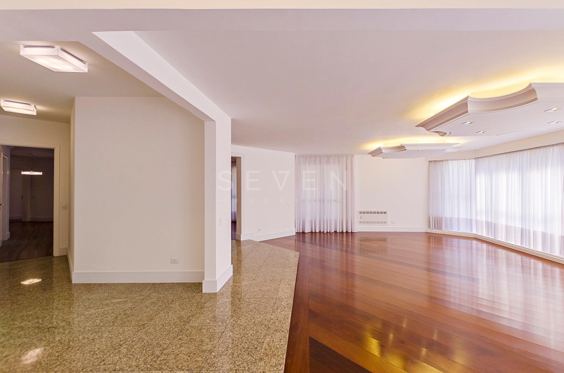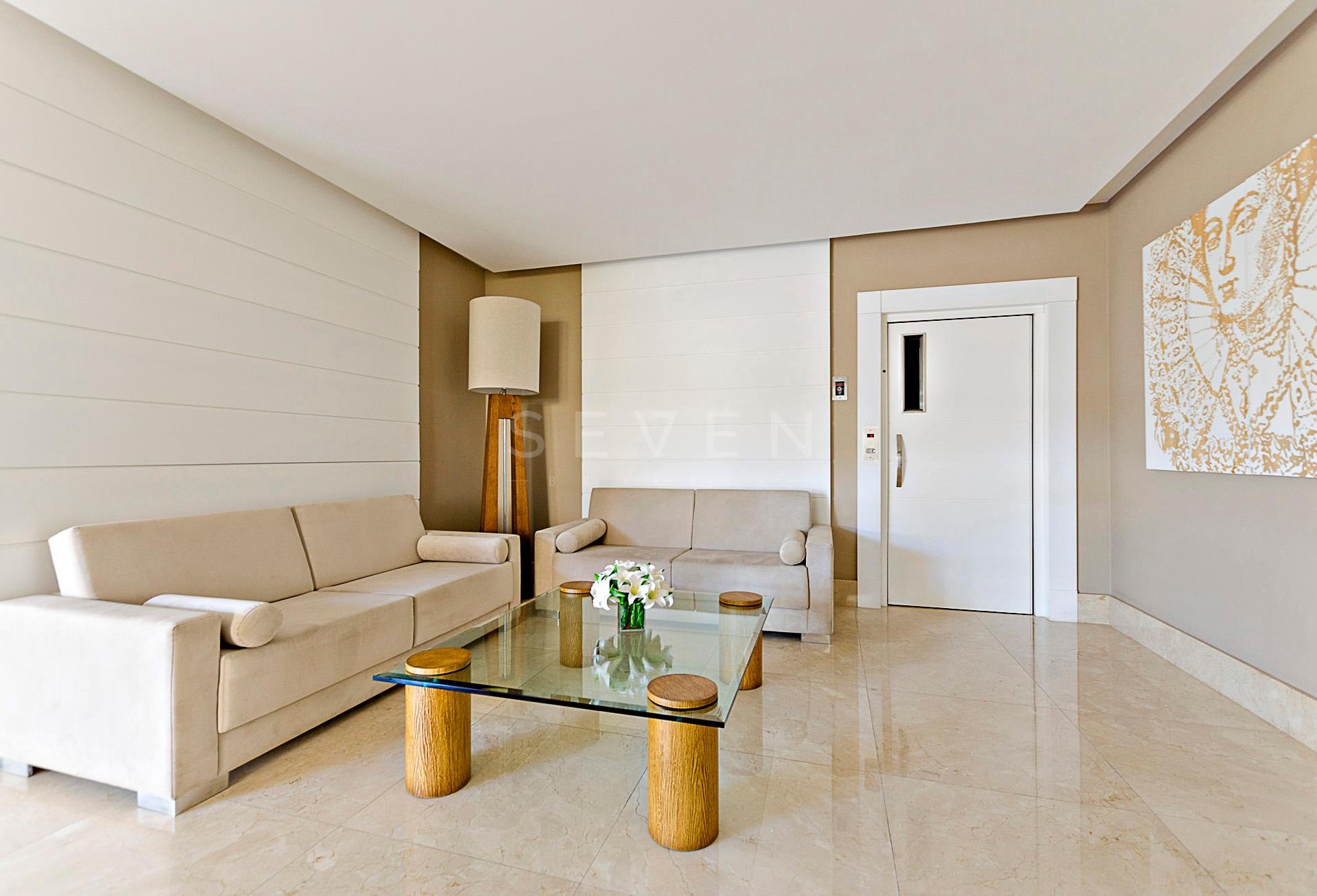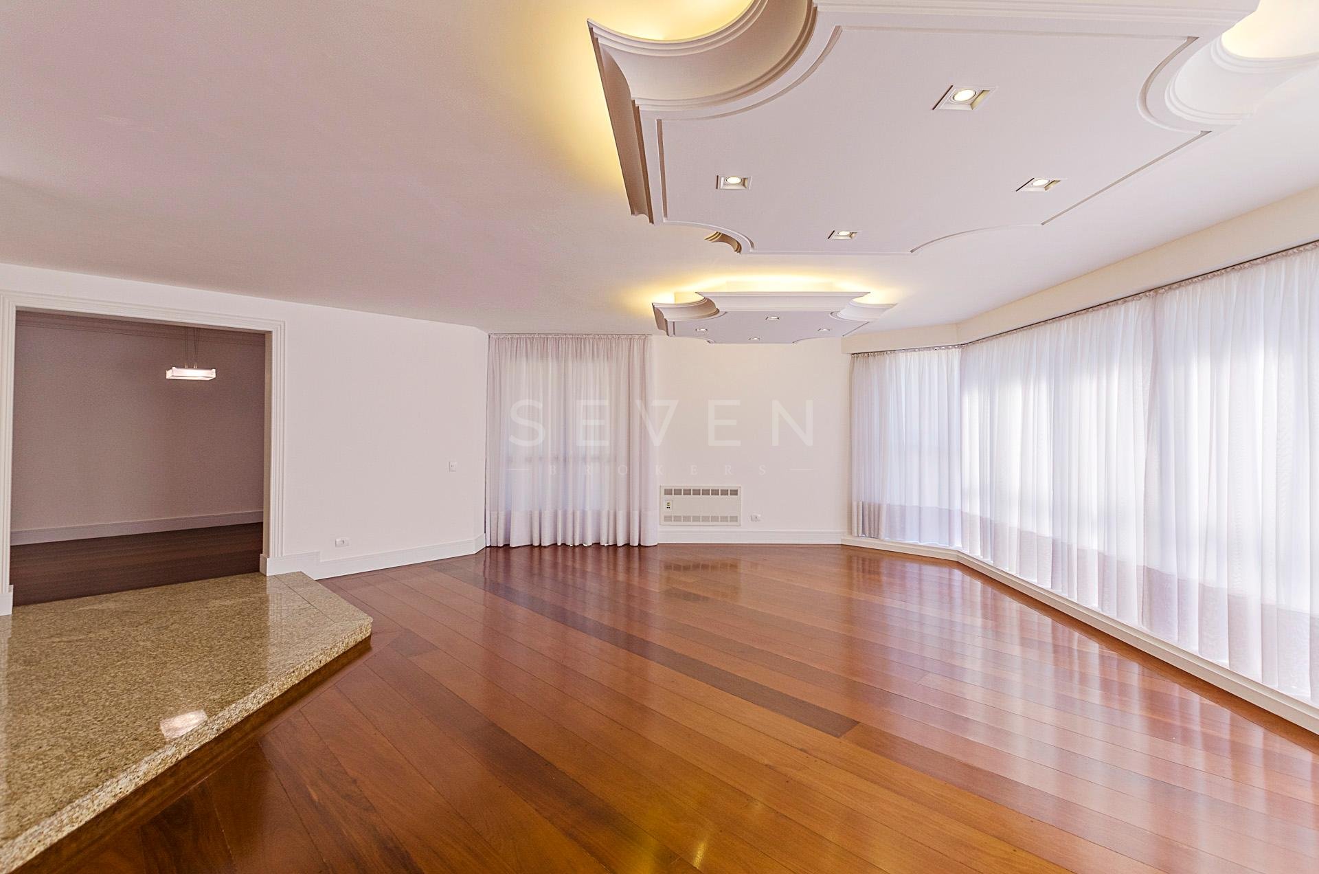 Um apartamento por andar, com hall privativo, lavabo, escritório e uma ampla sala social para três ambientes, em pele de vidro, com bar, sala de jantar, acesso a sacada, com piso em madeira maciça e iluminação indireta.