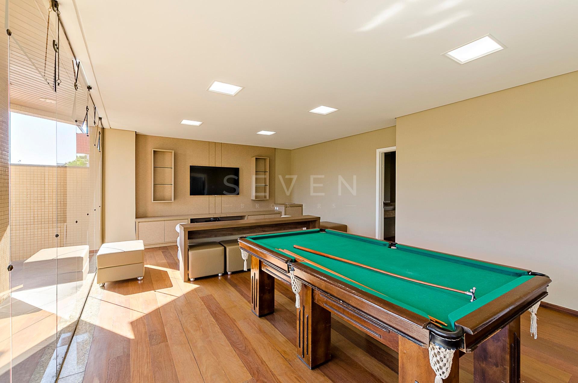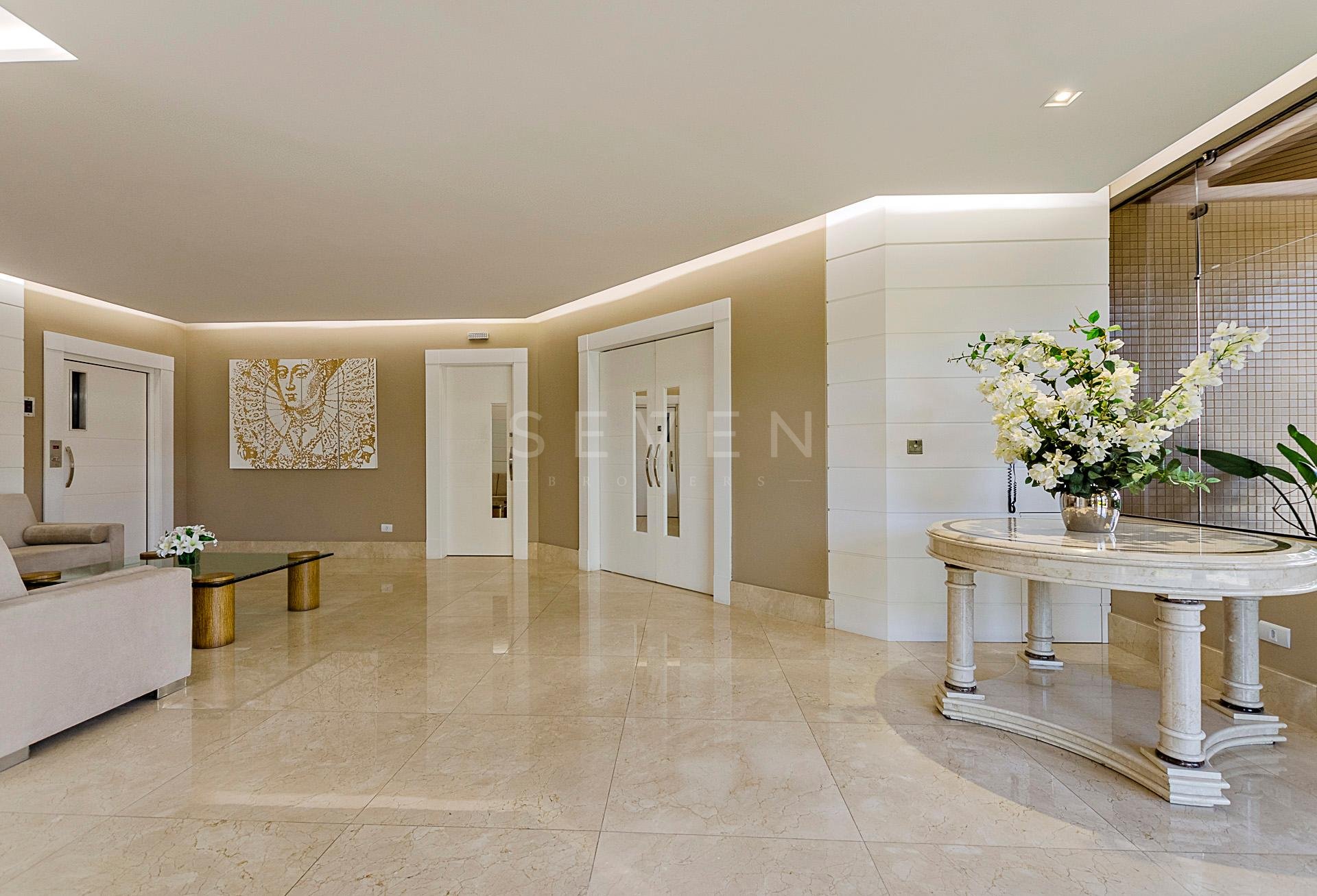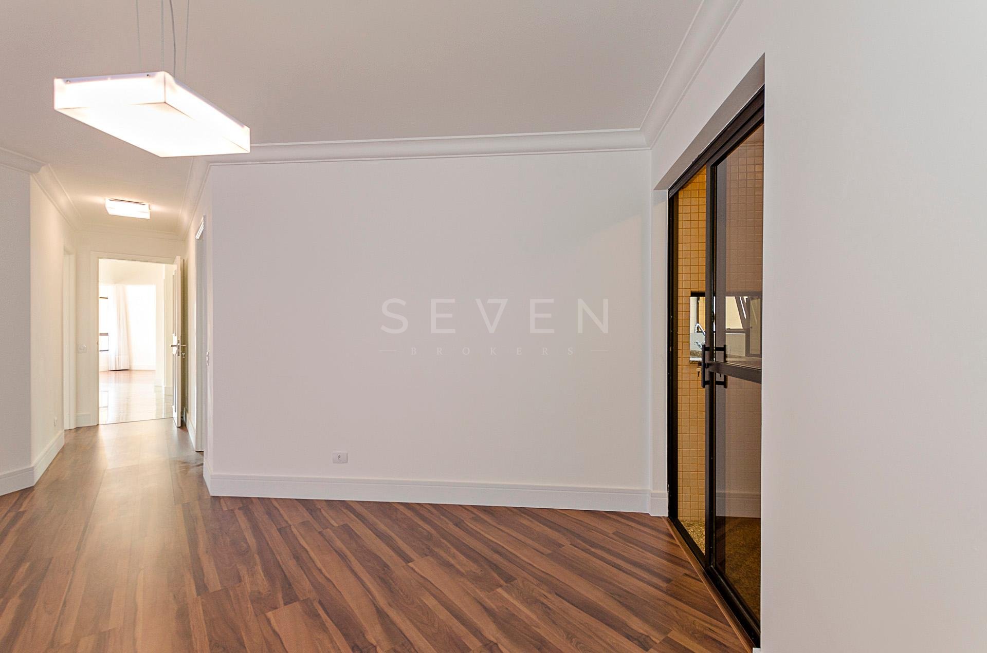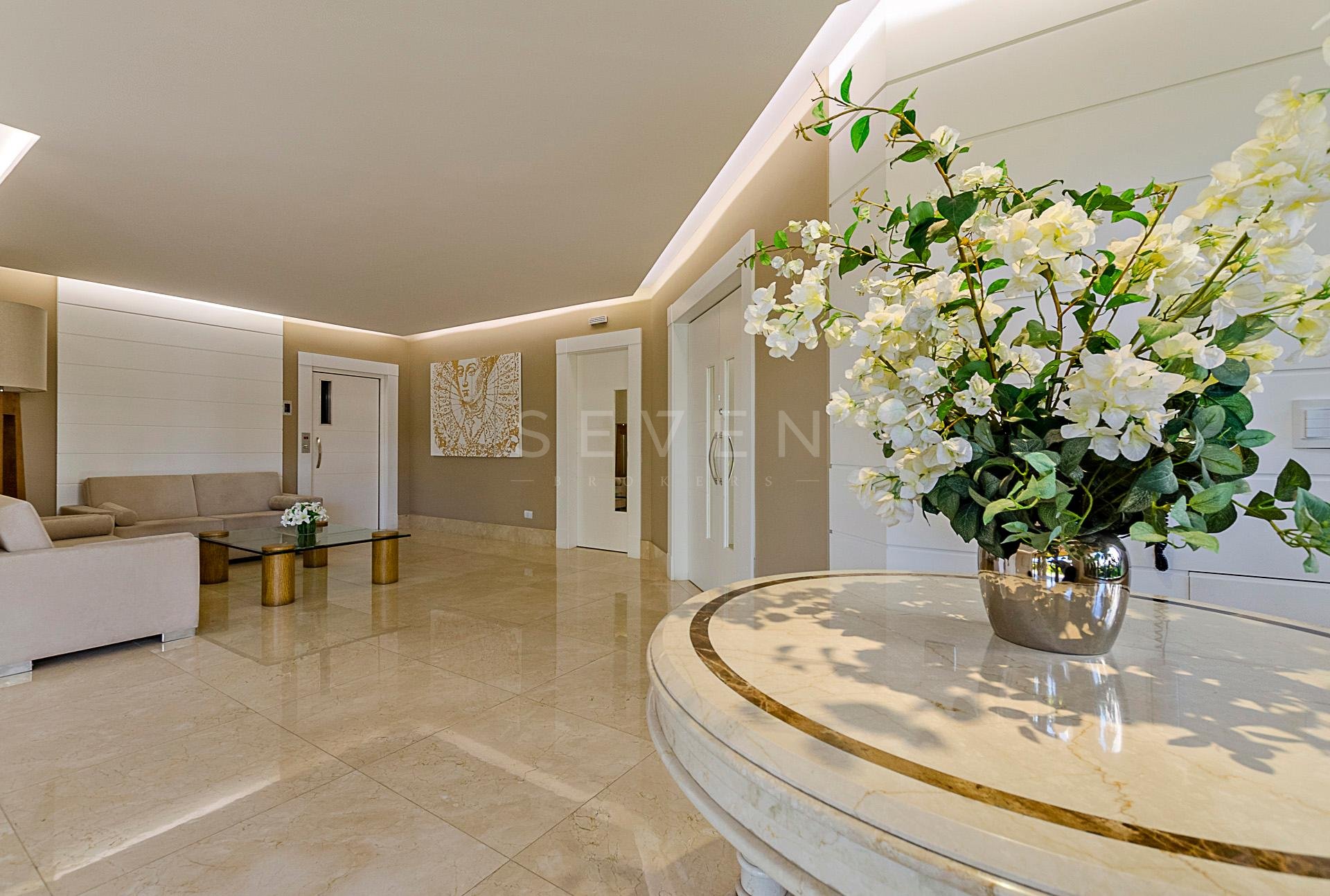 Um apartamento por andar, com hall privativo, lavabo, escritório e uma ampla sala social para três ambientes, em pele de vidro, com bar, sala de jantar, acesso a sacada, com piso em madeira maciça e iluminação indireta.