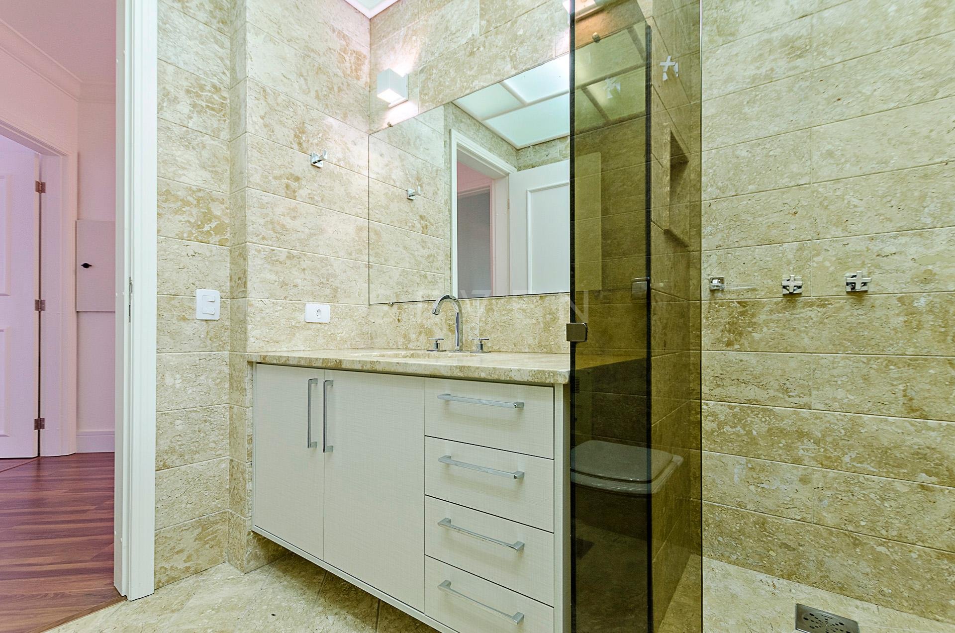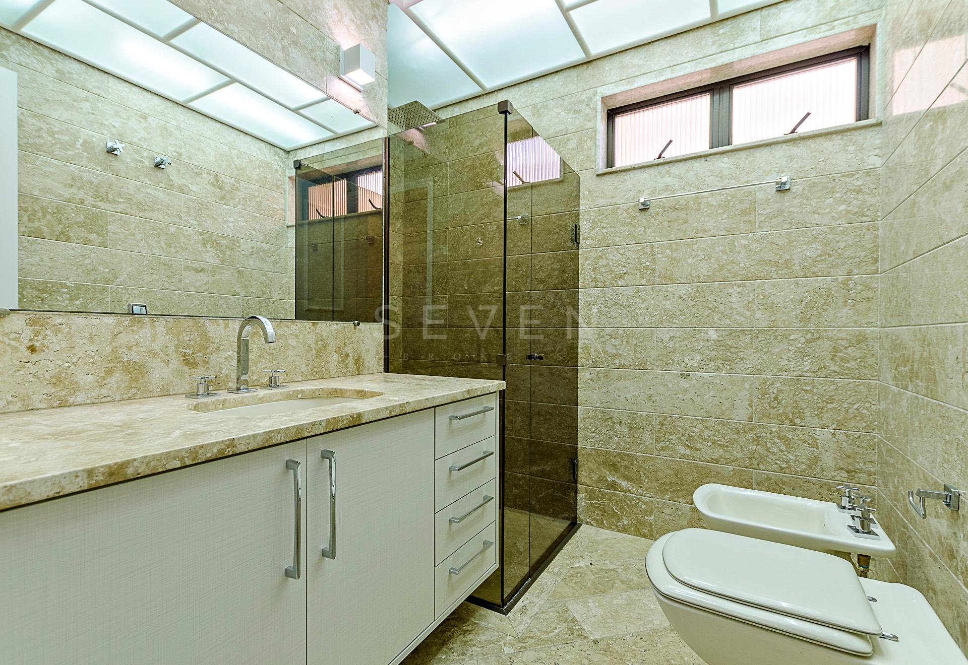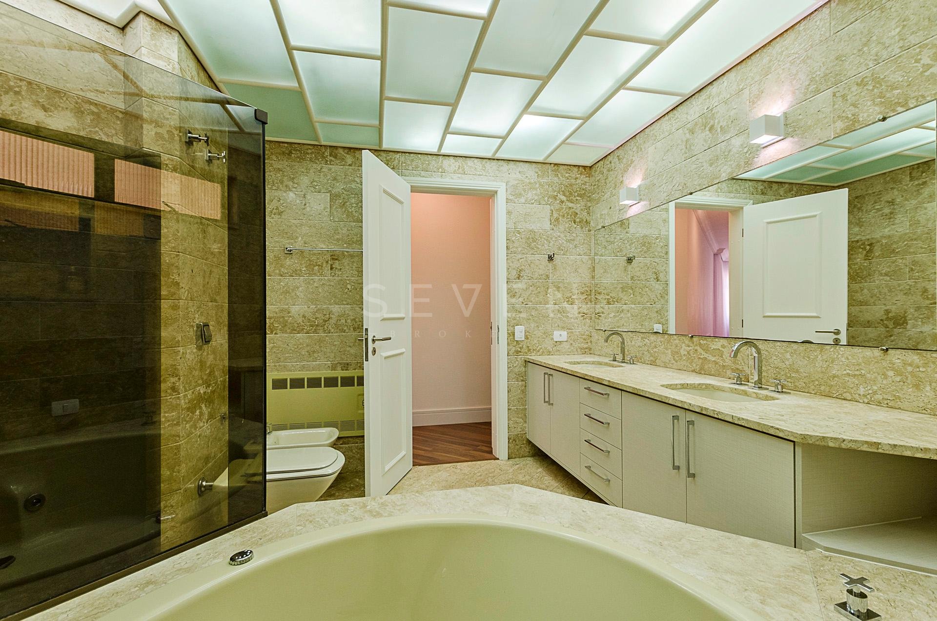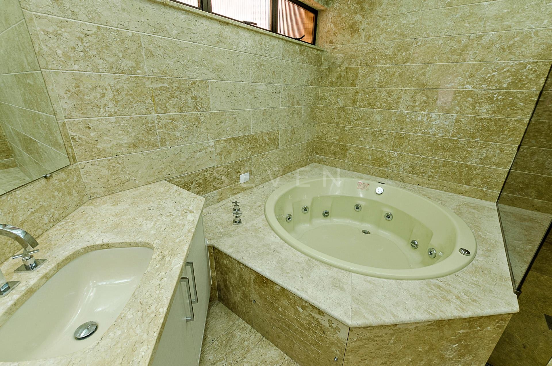 Quatro dormitórios com armários planejados, sendo duas suítes, júnior e máster com hidromassagem e closet, banheiros revestidos em mármore travertino.