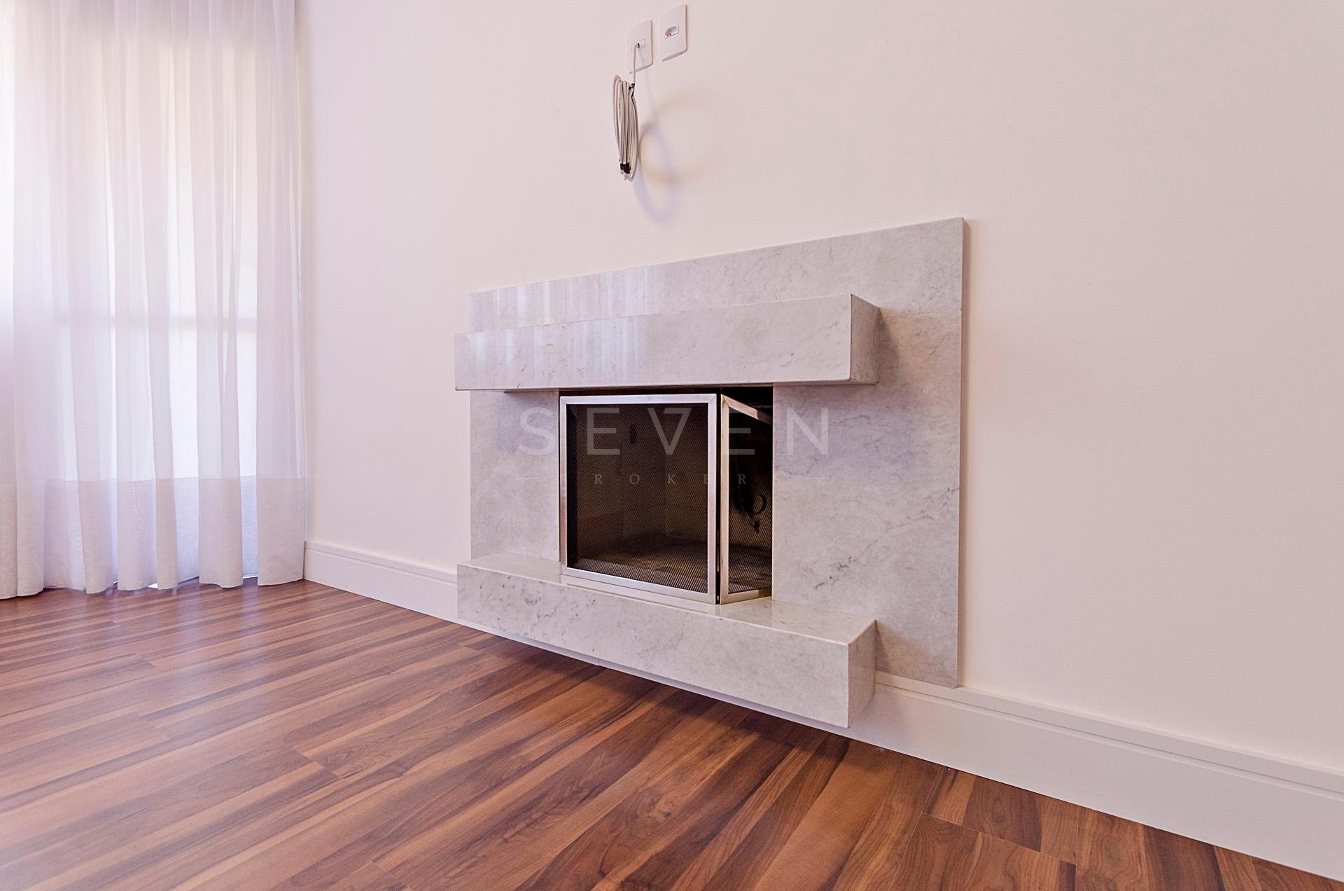 Sala de estar com lareira e acesso a sacada, integrada com a copa e a churrasqueira a carvão, com piso em granito.