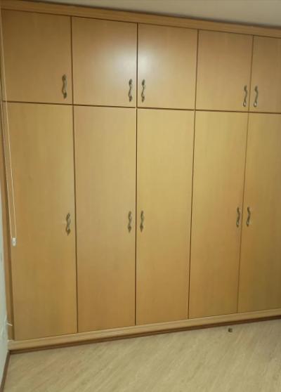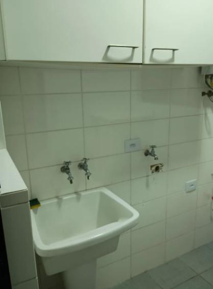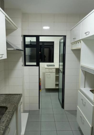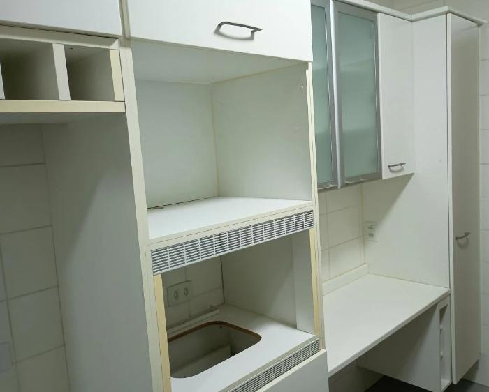 Cozinha e área de serviço com móveis planejados, em excelente estado de conservação