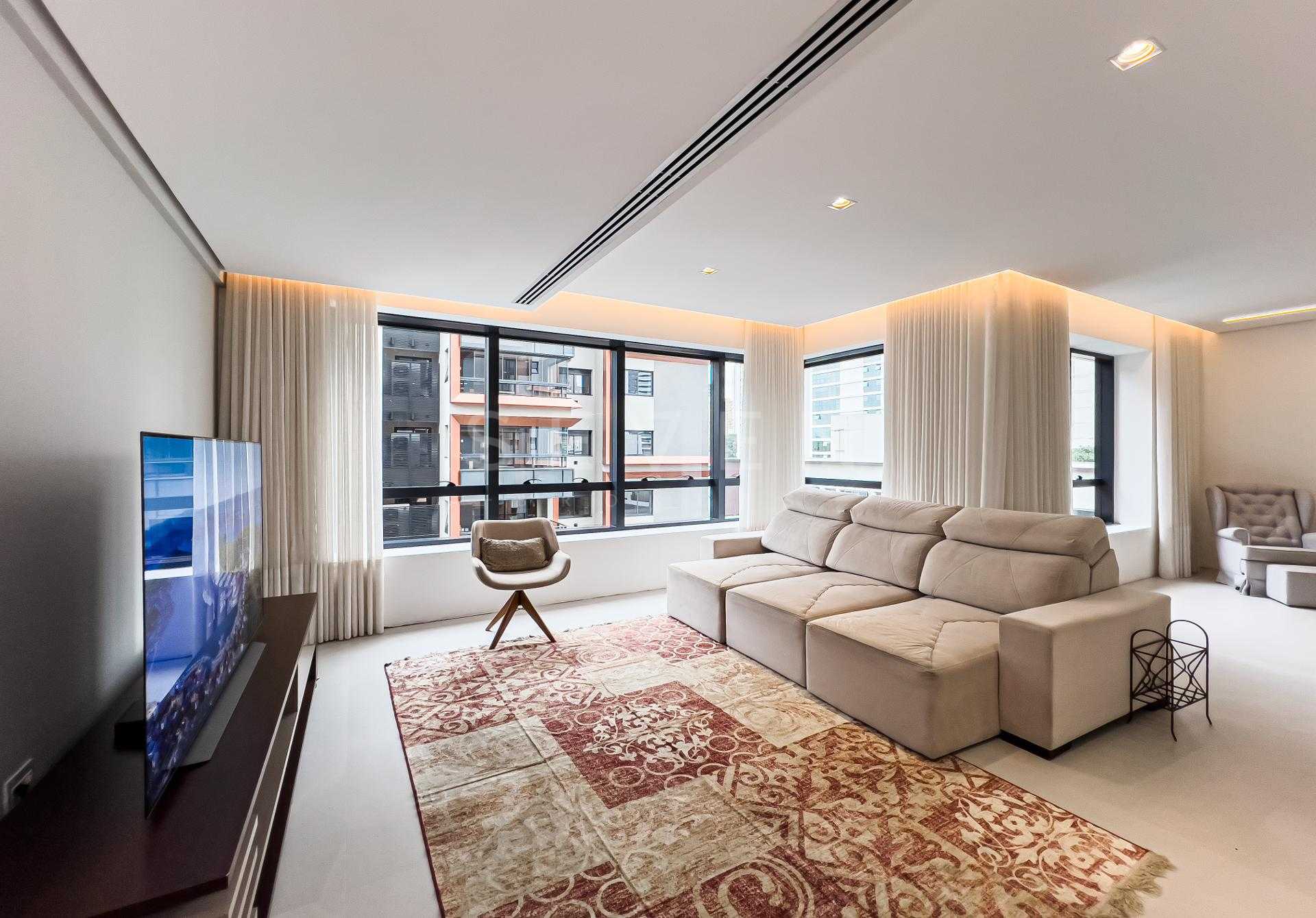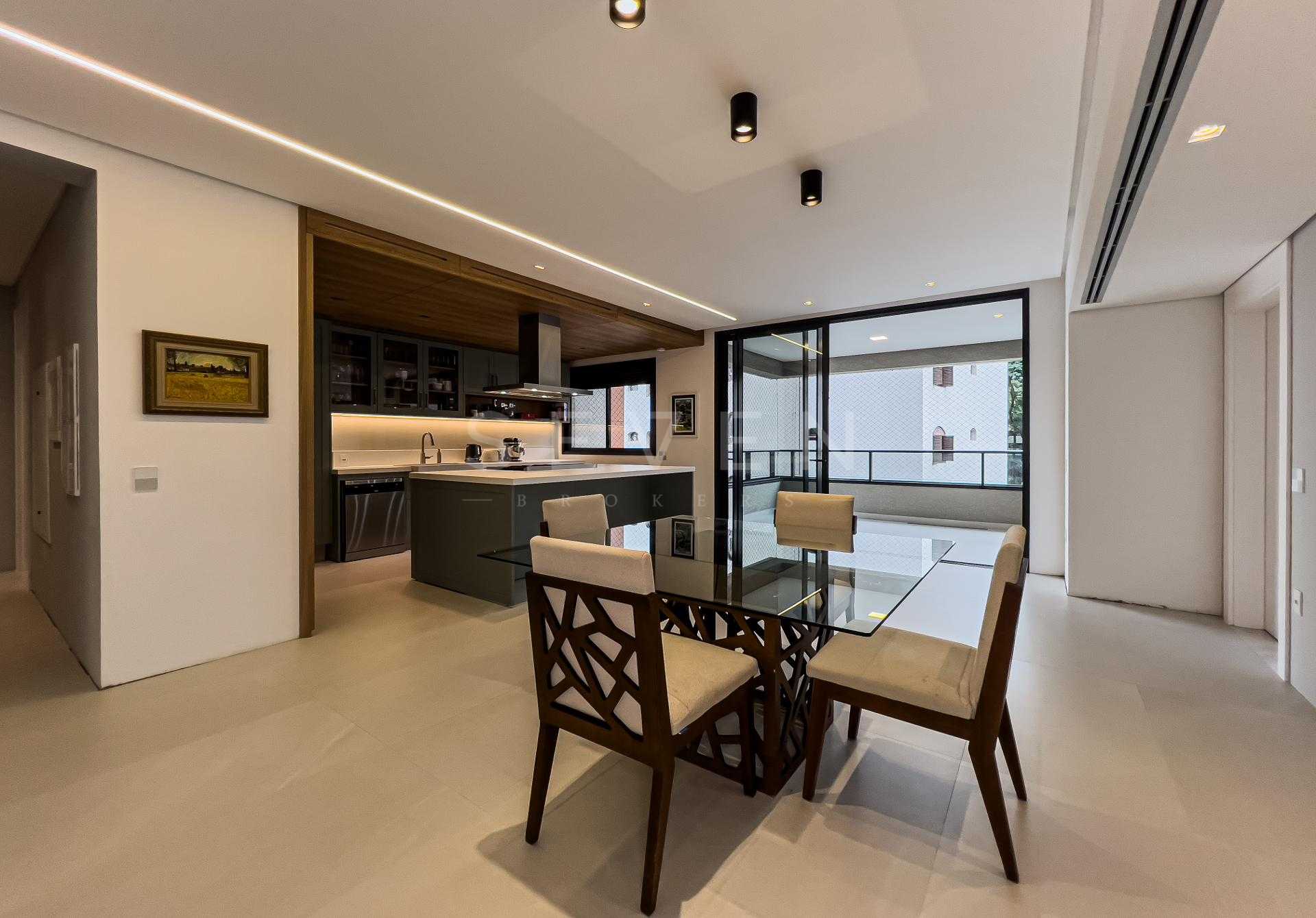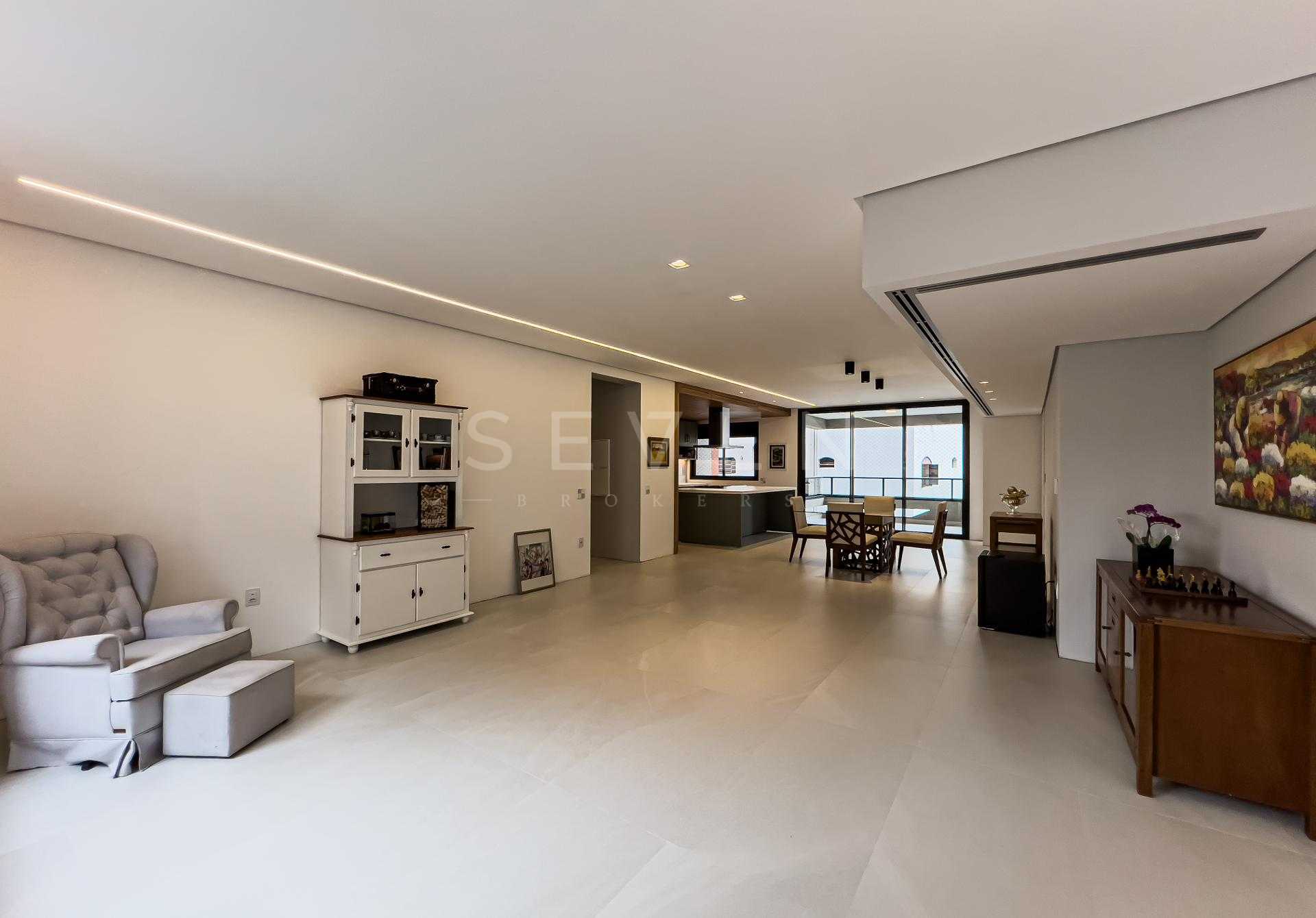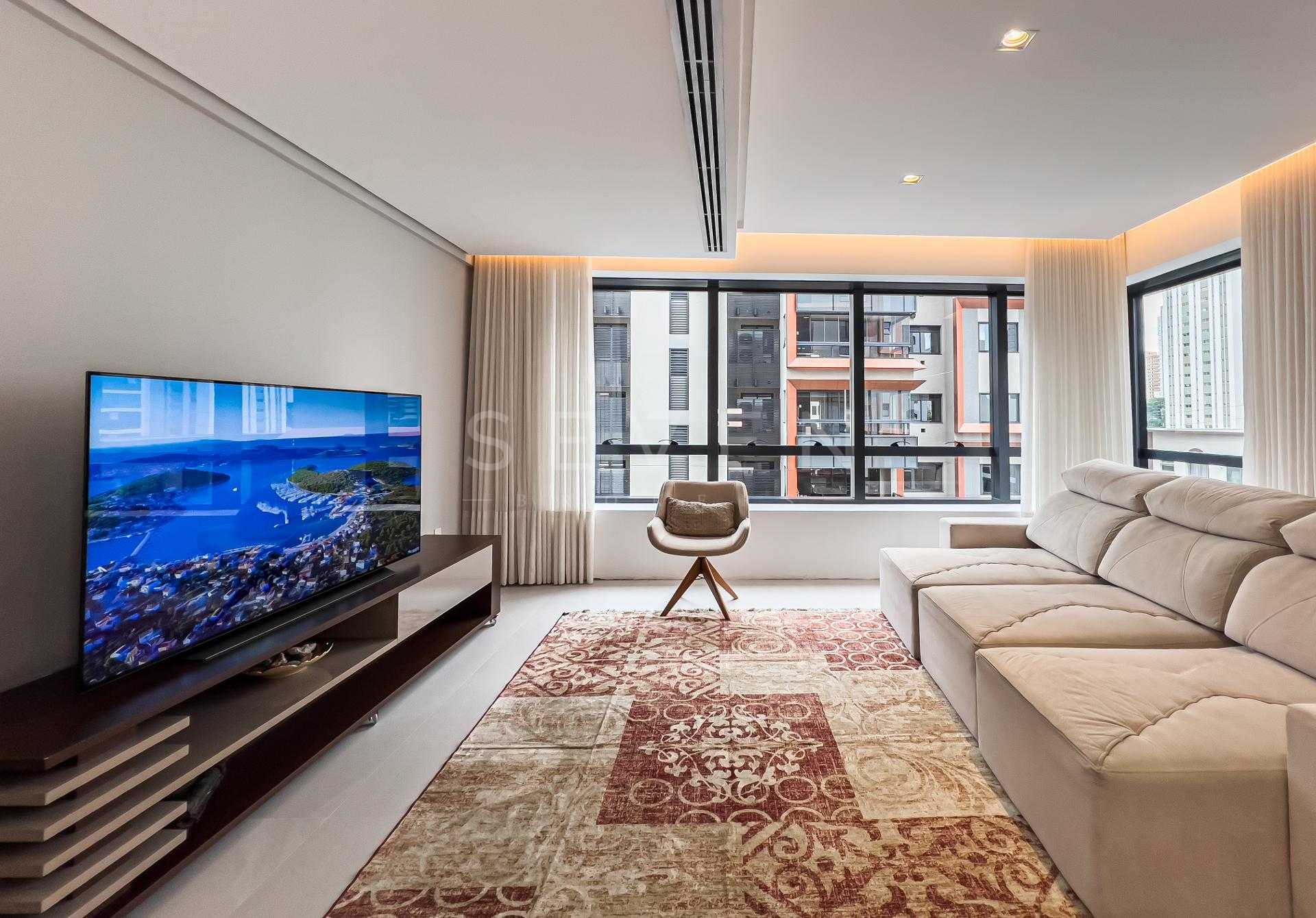 Com 227,98 m² privativos, o layout privilegia integração e funcionalidade, criando ambientes acolhedores e ao mesmo tempo sofisticados. Totalmente mobiliado com peças assinadas pela Mobitec, o apartamento conta com automação completa, permitindo o controle de iluminação, som e persianas blackout de forma simples e intuitiva.