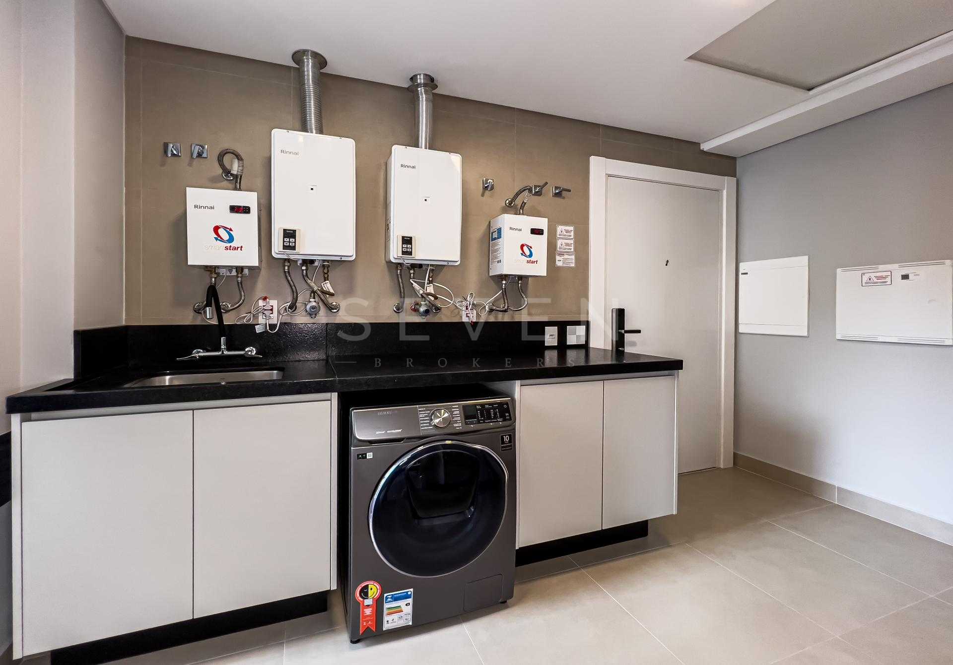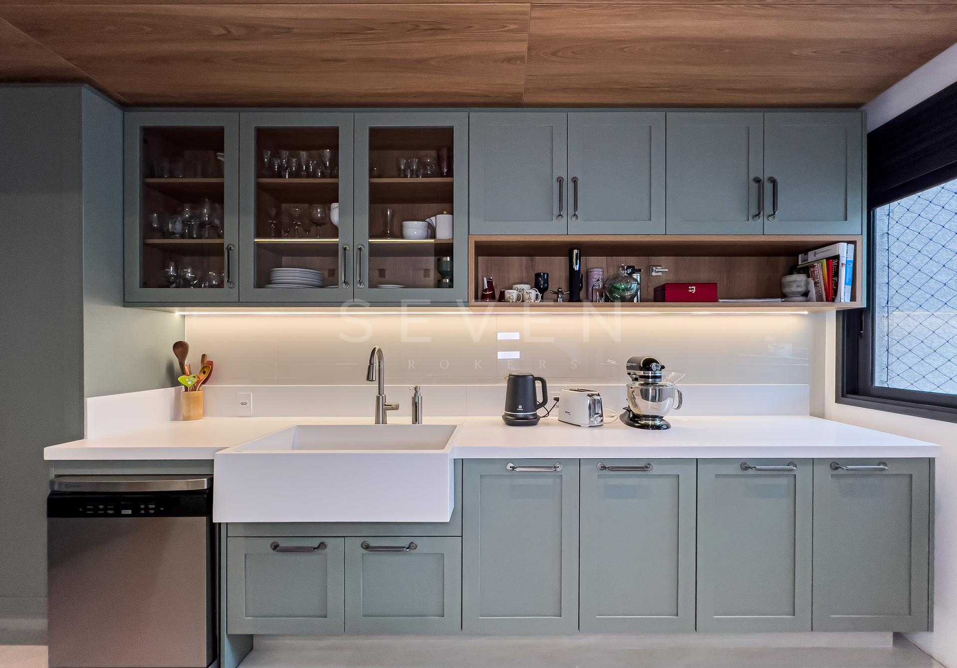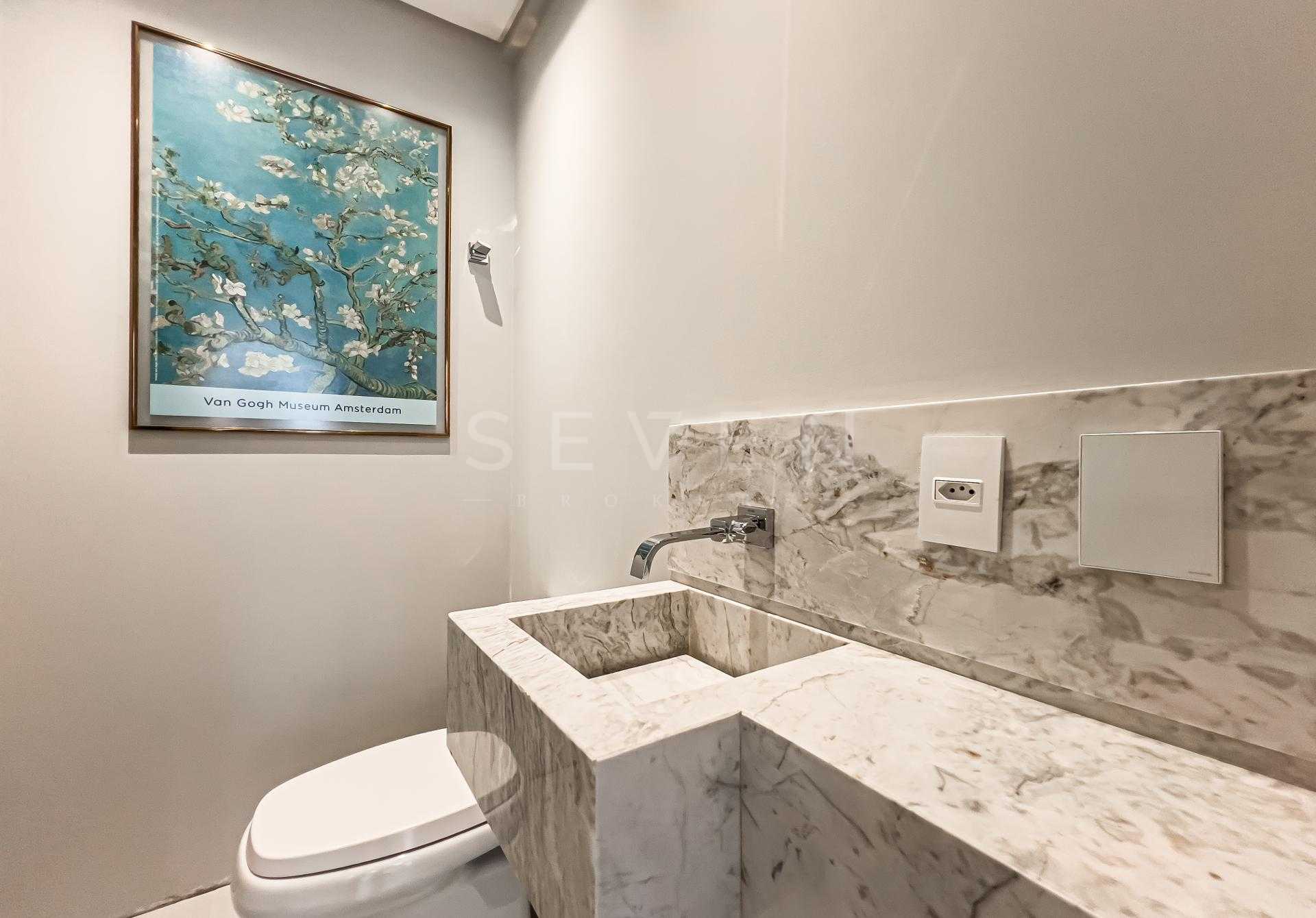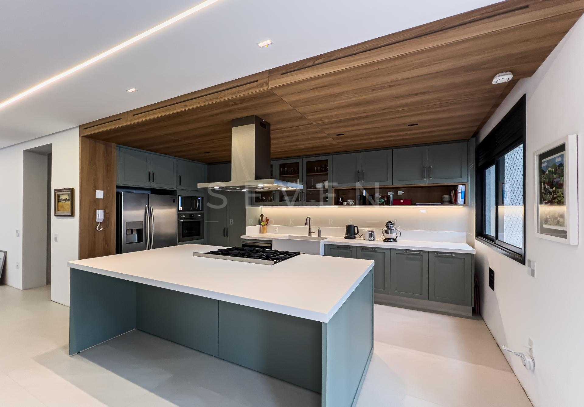 A área social apresenta cozinha integrada e acabamentos de alto padrão, ideal para receber. Na área íntima, o conforto é garantido pelo piso de madeira natural, enquanto porcelanatos Portobello valorizam os demais ambientes. Os banheiros são revestidos em mármore, com box do piso ao teto e iluminação embutida, reforçando a estética elegante e atemporal.