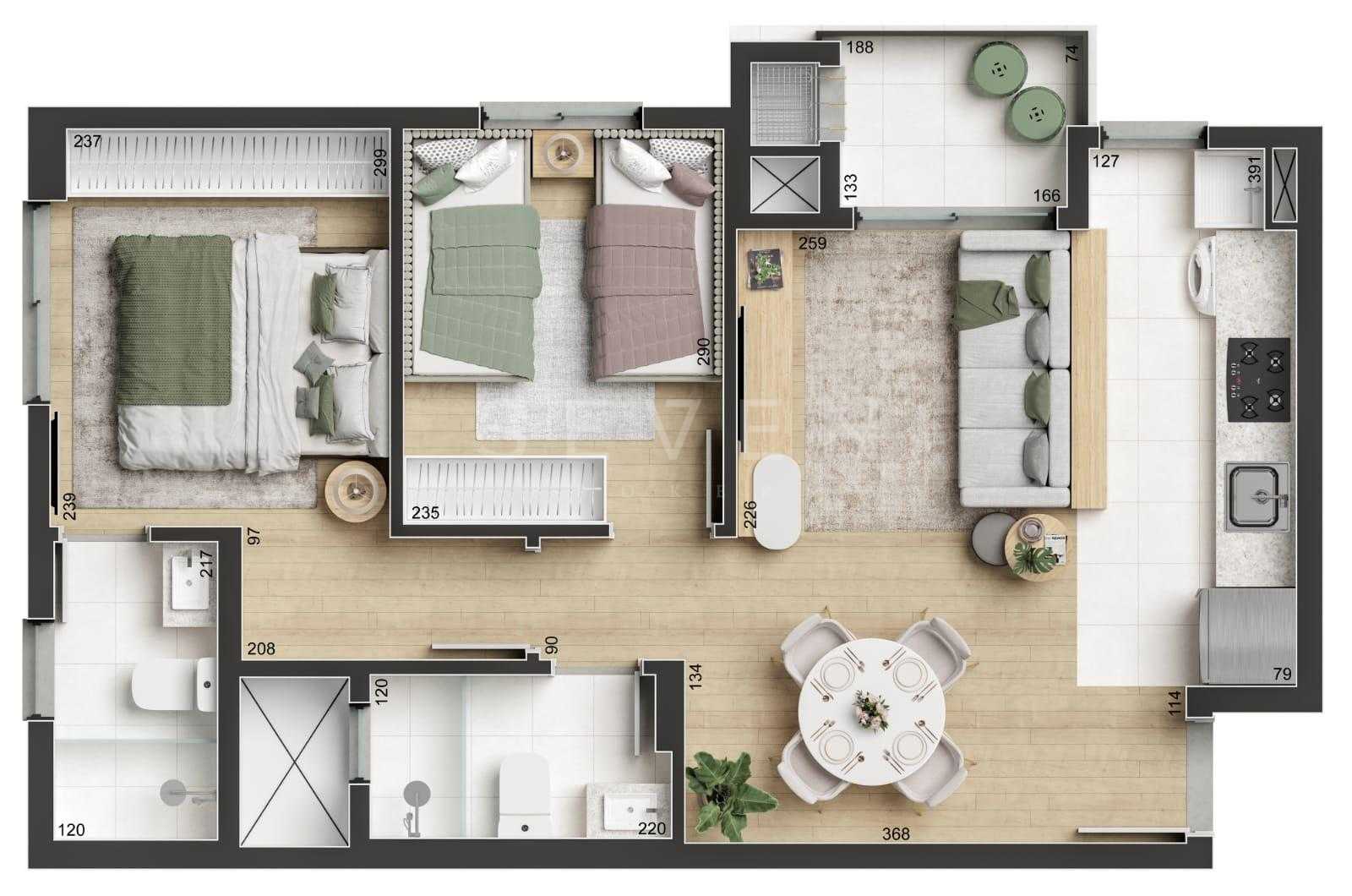 54,22m² de área privativa com ótima distribuição dos ambientes.