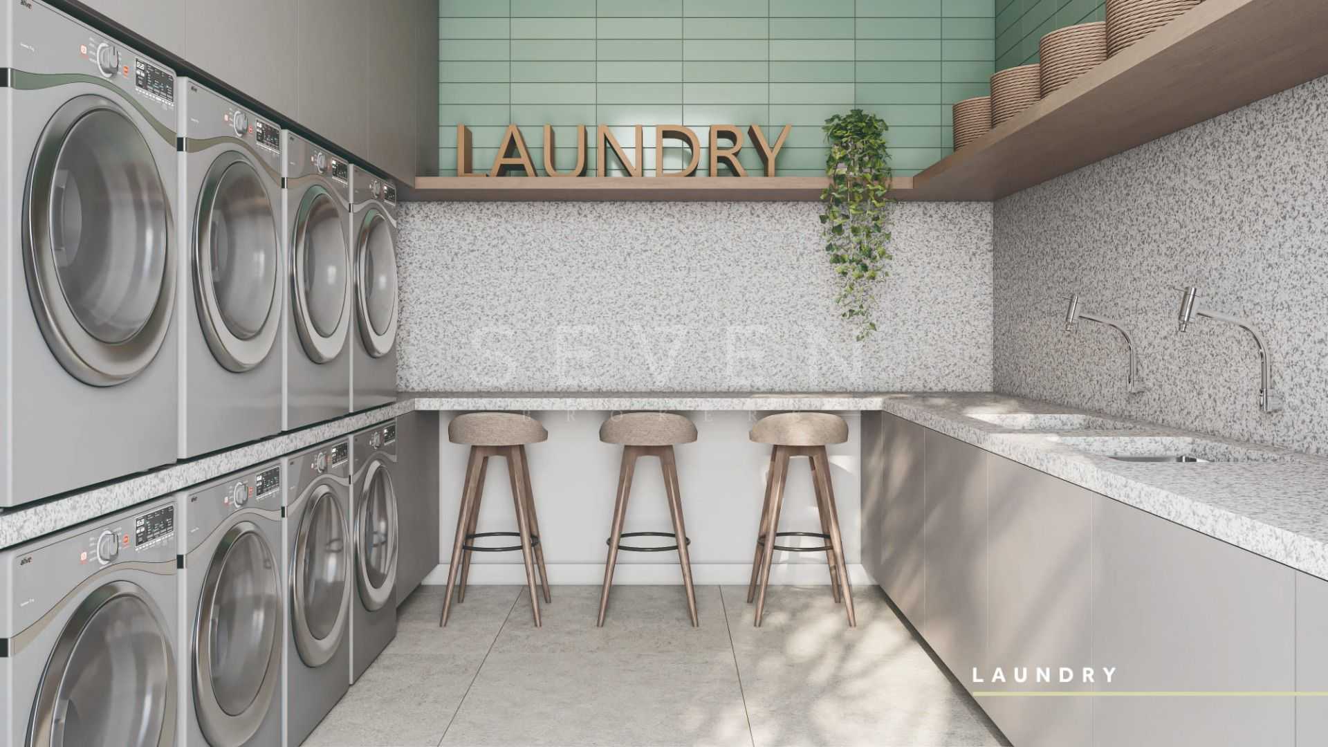 Lavanderia funcional, com espaço para máquina de lavar, tanque e armazenamento.