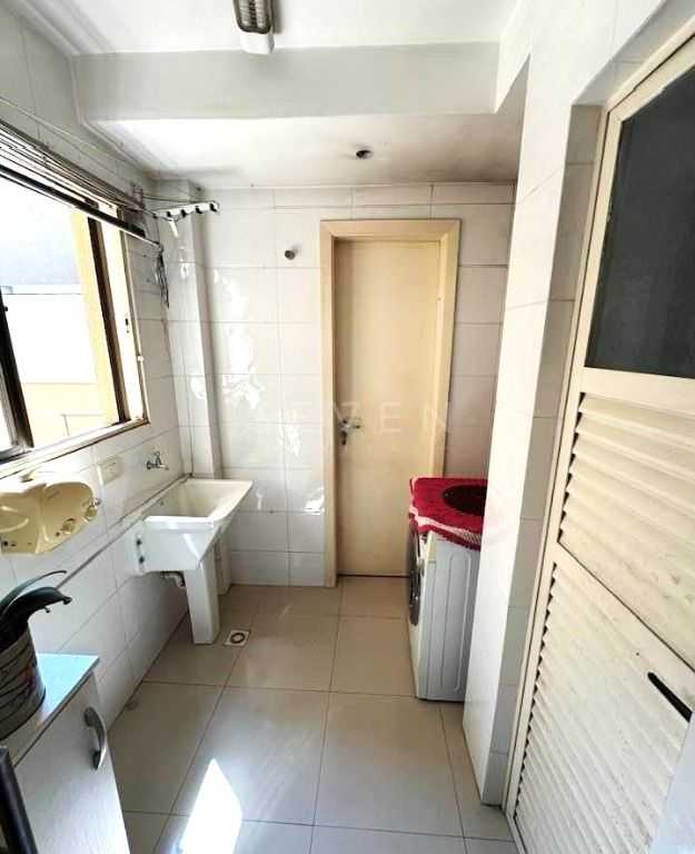 Cozinha, banheiros e área de serviço com piso porcelanato.