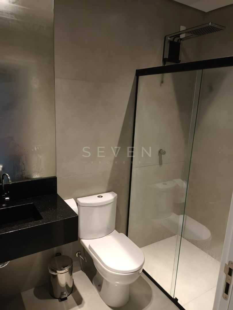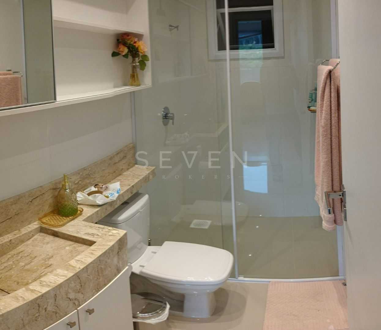 Banheiro social bem distribuído, com box de vidro do piso ao teto