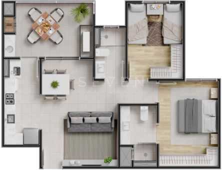 Apartamento no 11° andar com dois quartos, sendo uma suíte, sala de jantar e estar integradas, cozinha americana e varanda com churrasqueria.