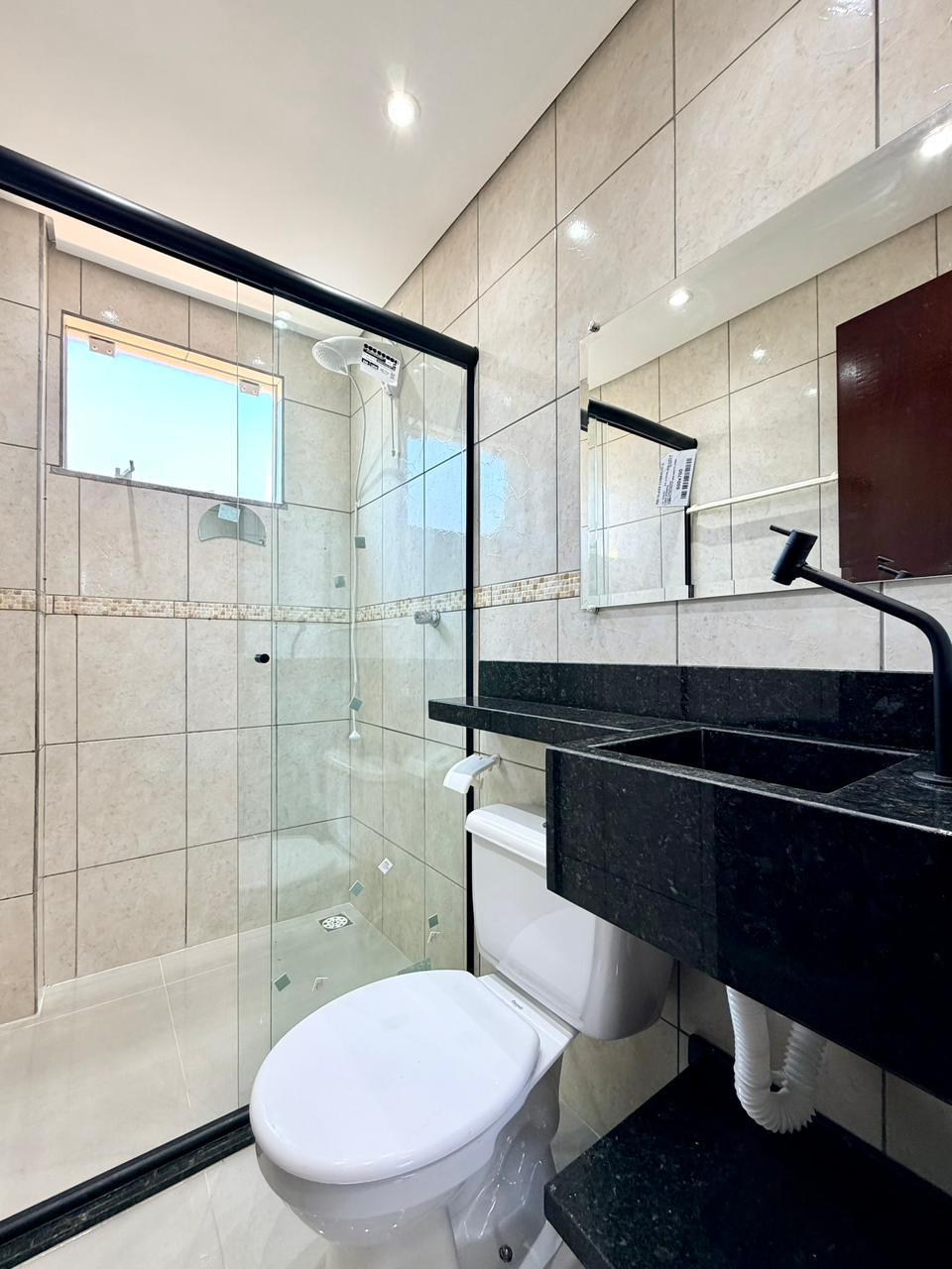 Banheiro social moderno, equipado com box de vidro e pia esculpida, trazendo sofisticação ao ambiente