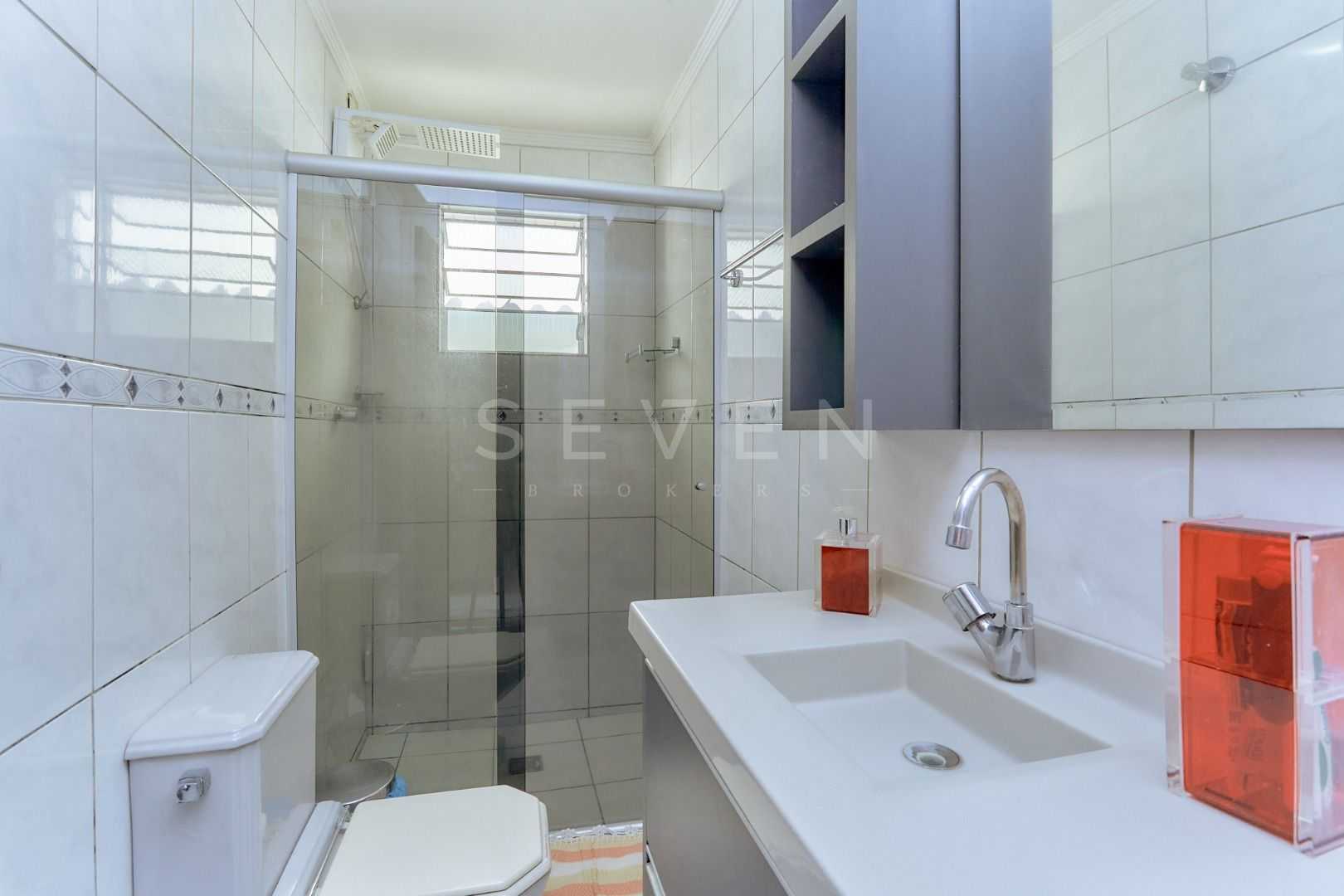 Banheiro social moderno: com box de vidro, pia com armário e acabamento de qualidade, combinando funcionalidade com estilo.
