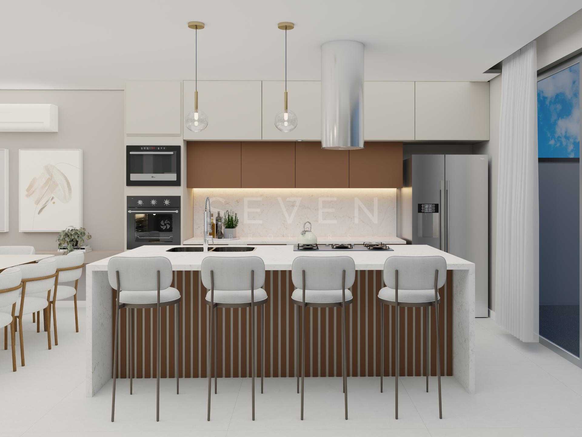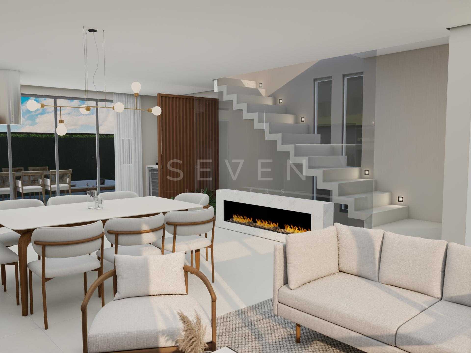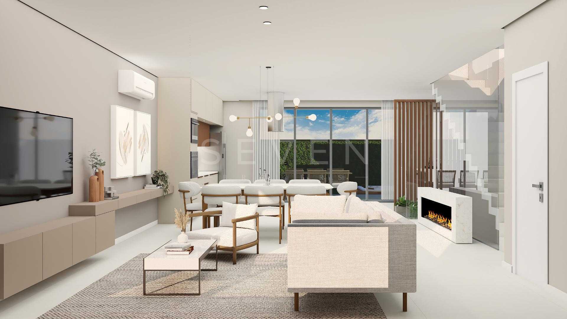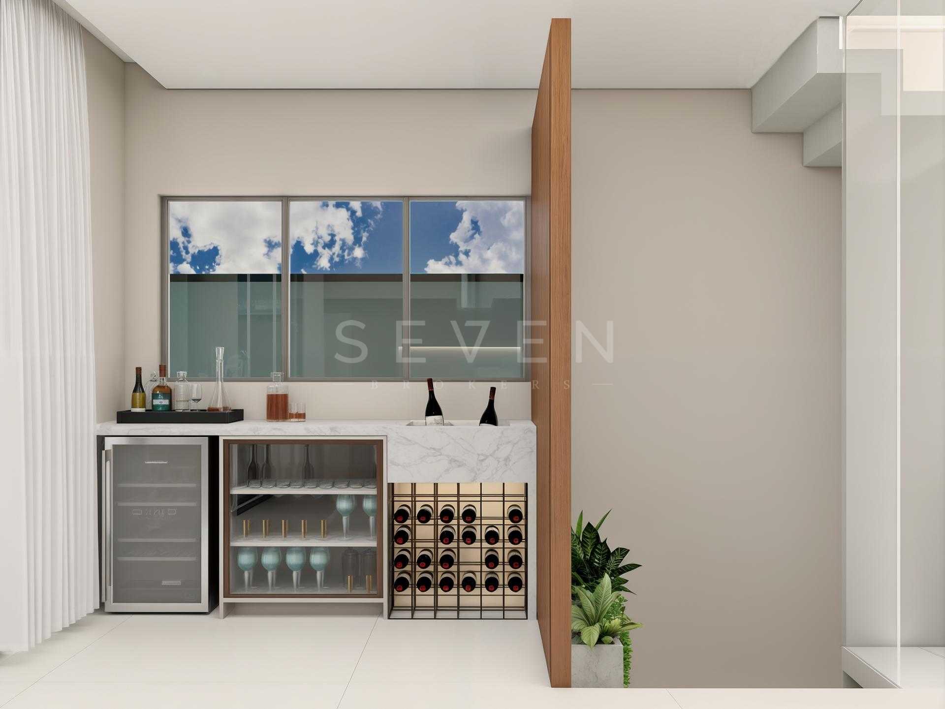 Terreo com sala de estar, integrada com jantar, espaço adega, lavabo e cozinha com varanda gourmet, churrasqueira a carvao, e um amplo quintal com espaço para jacuzzi e grama.