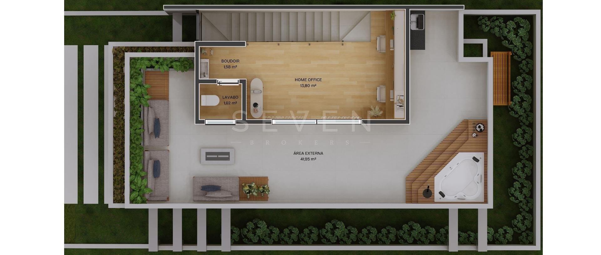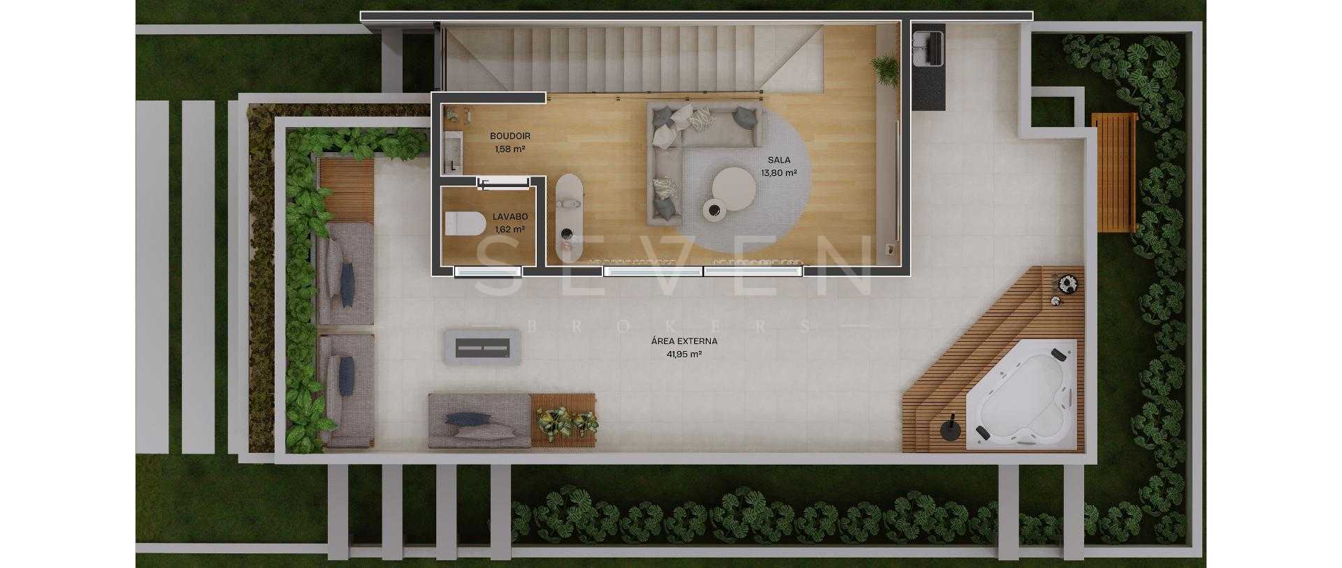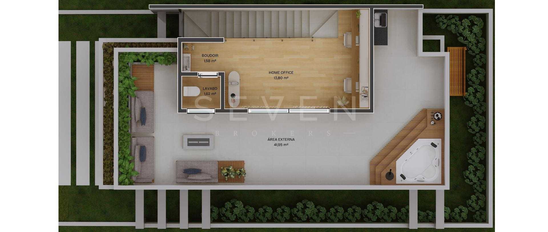 Espaço para home office ou estar intimo, lavabo com boudoir e ampla area descoberta com infra para Jacuzzi.