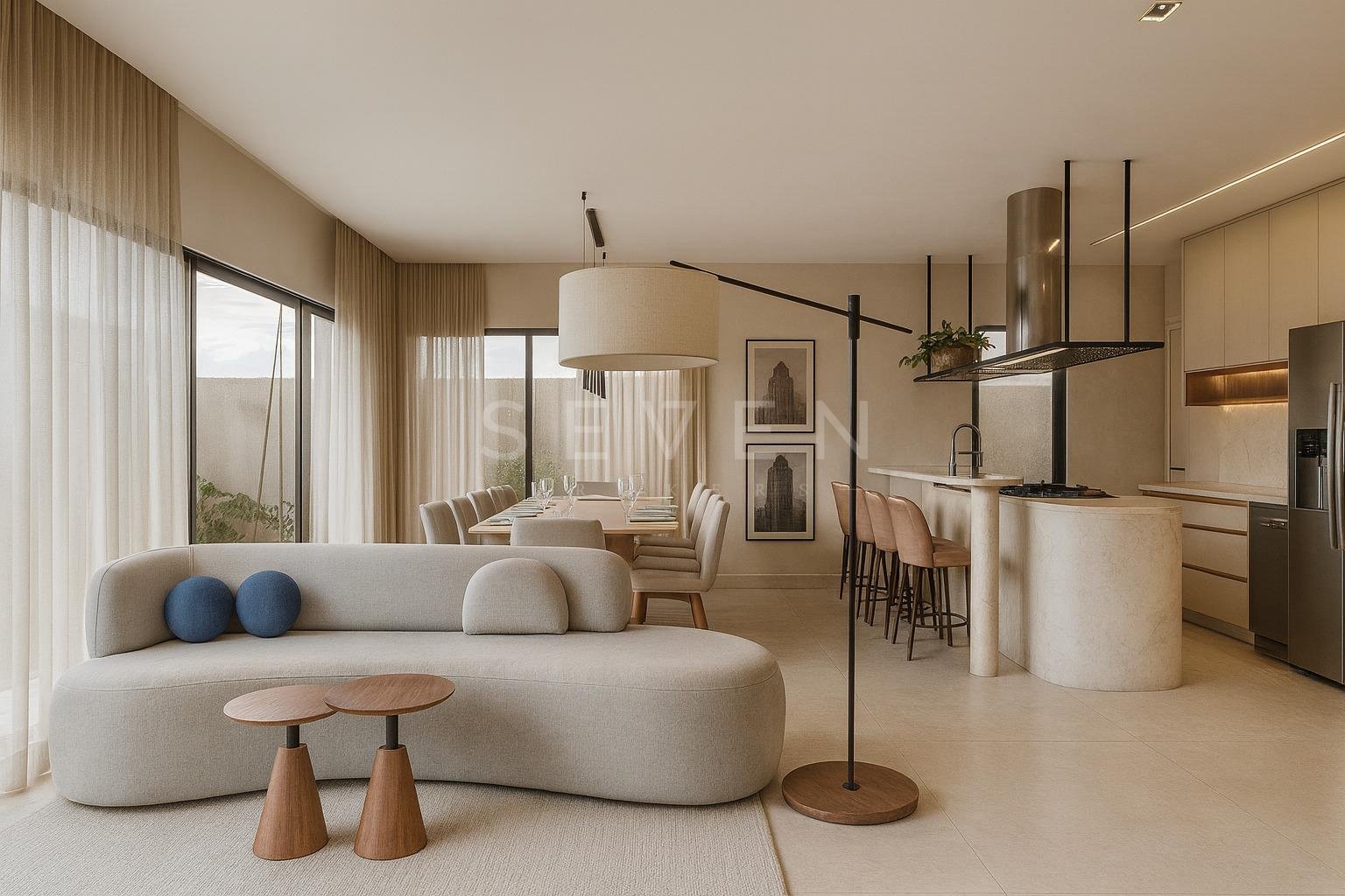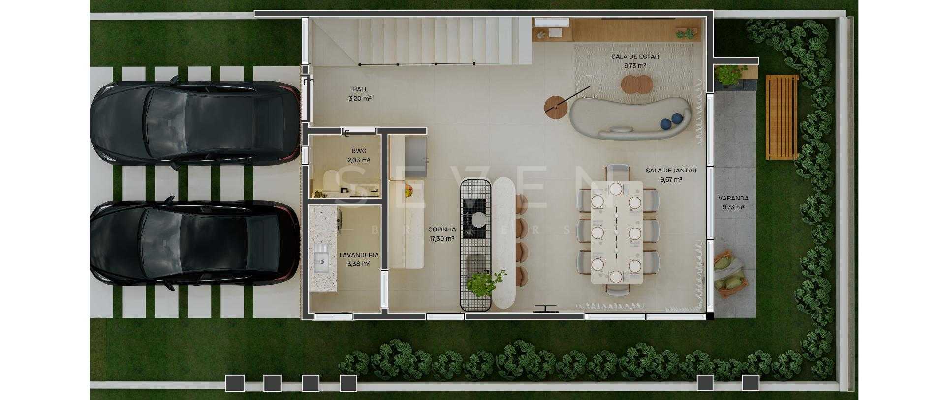 Terreo com sala de estar, integrada com jantar, espaço adega, lavabo e cozinha com varanda gourmet, churrasqueira a carvao, e um quintal com grama.