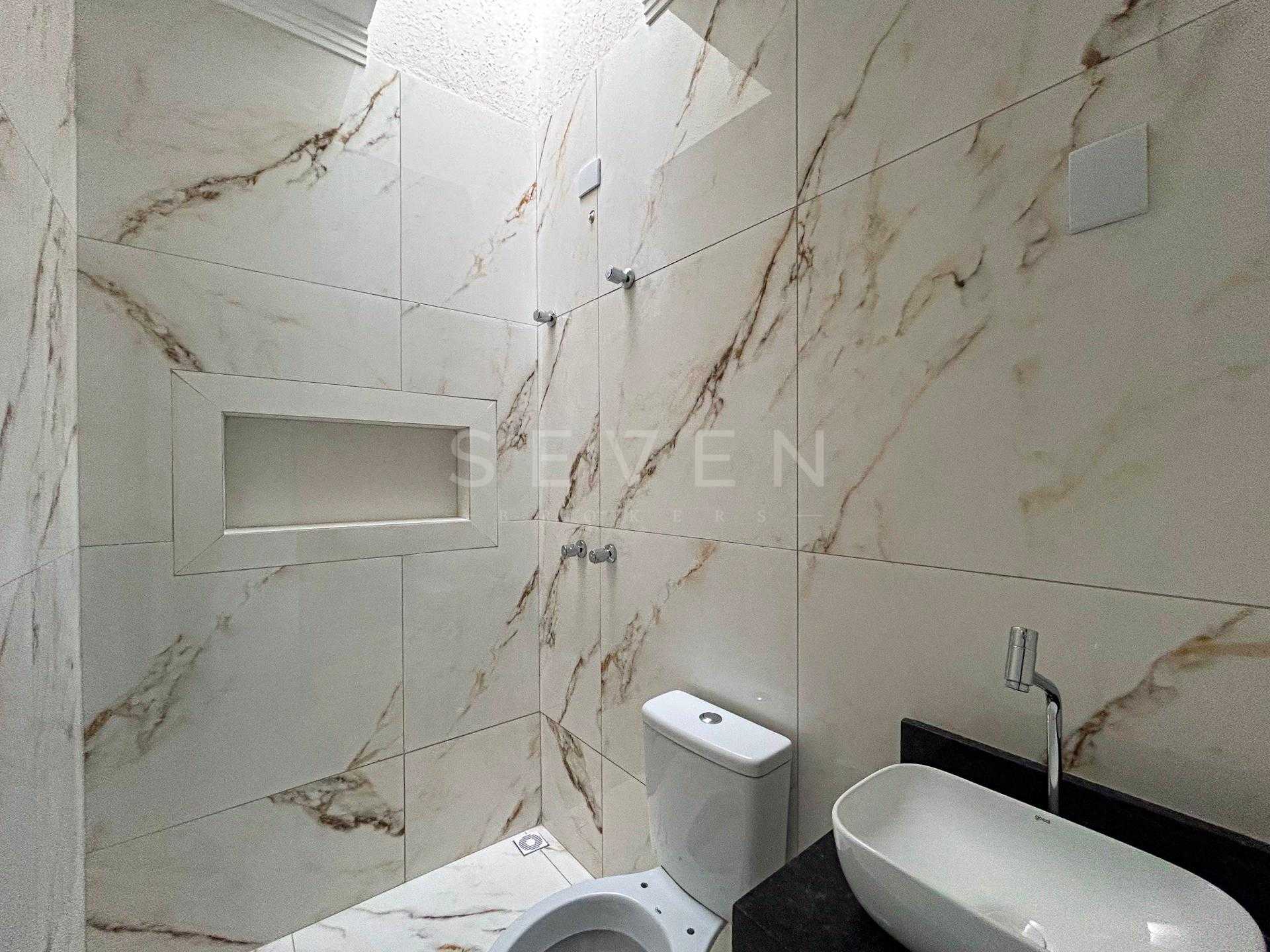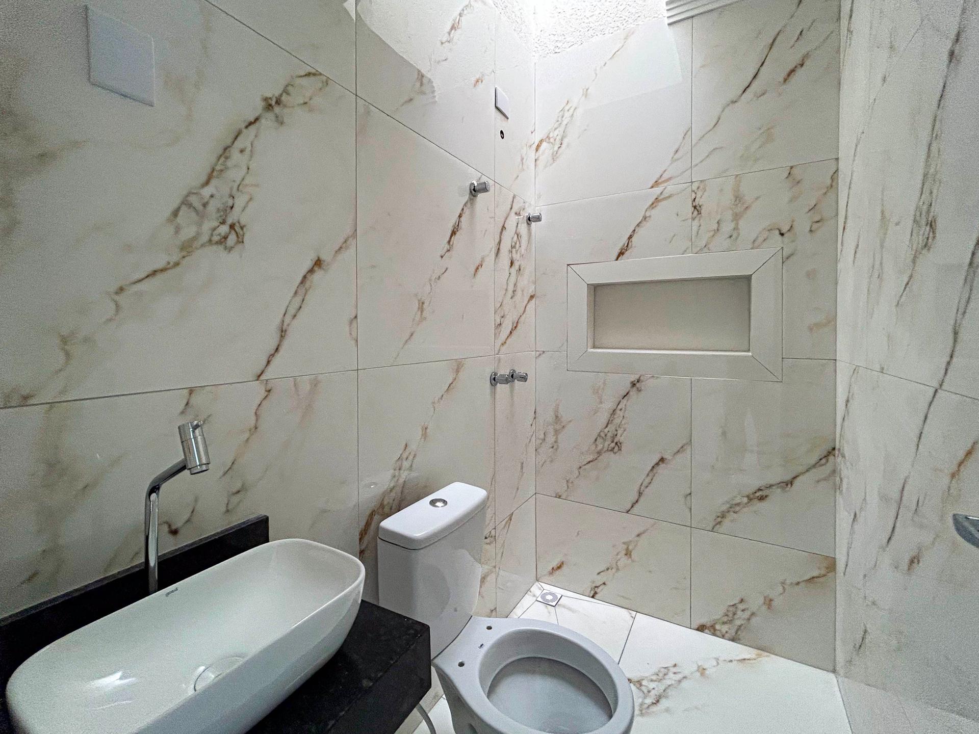 Banheiro social com pia e nicho em granito