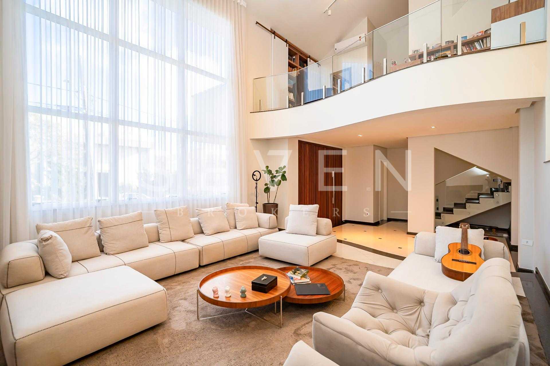 • Sala com pé-direito duplo, lareira e muita luz natural
