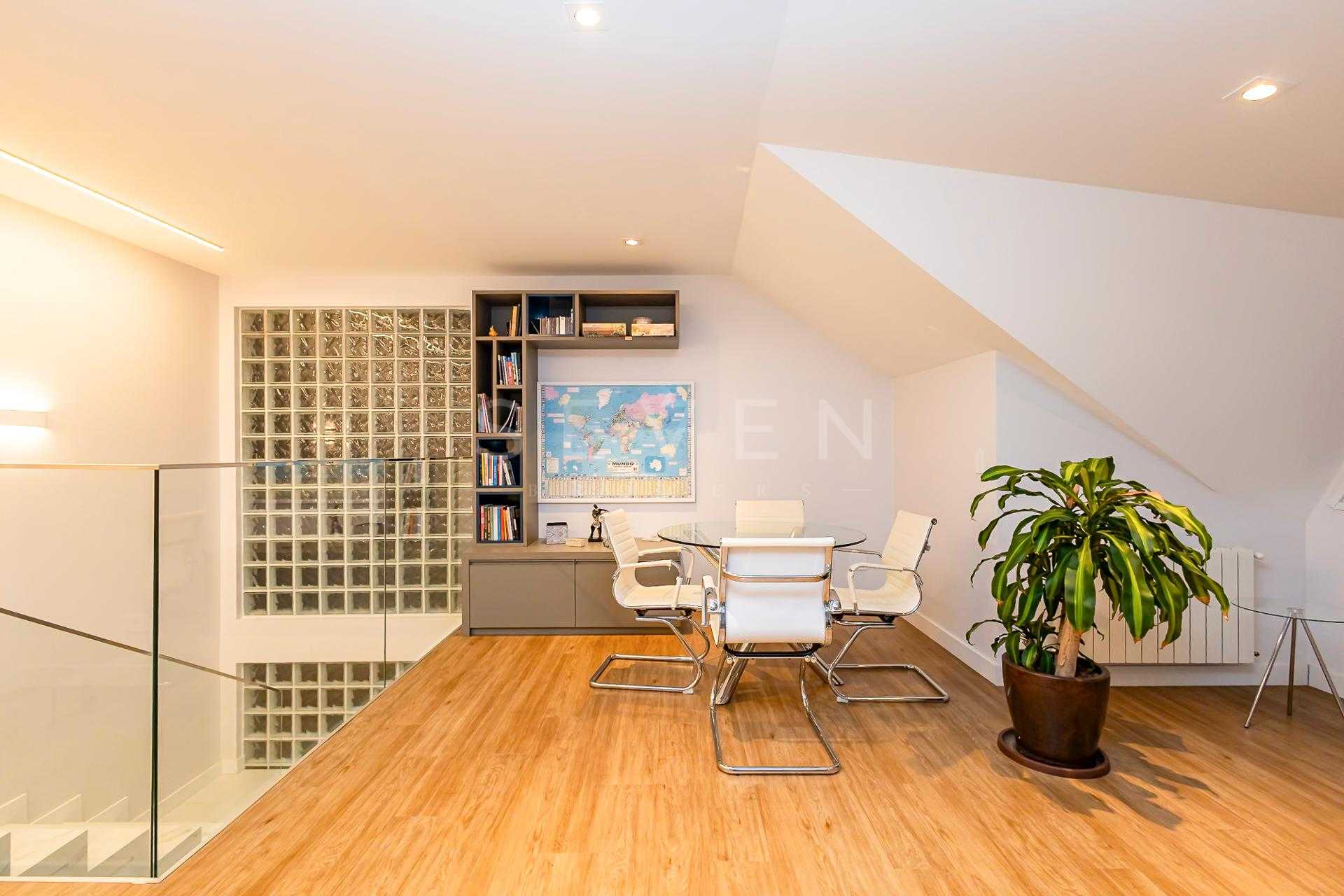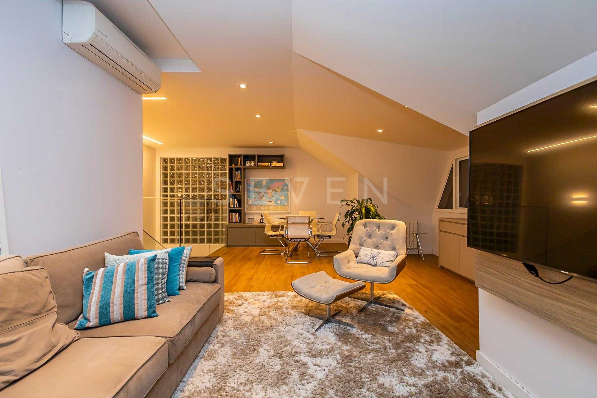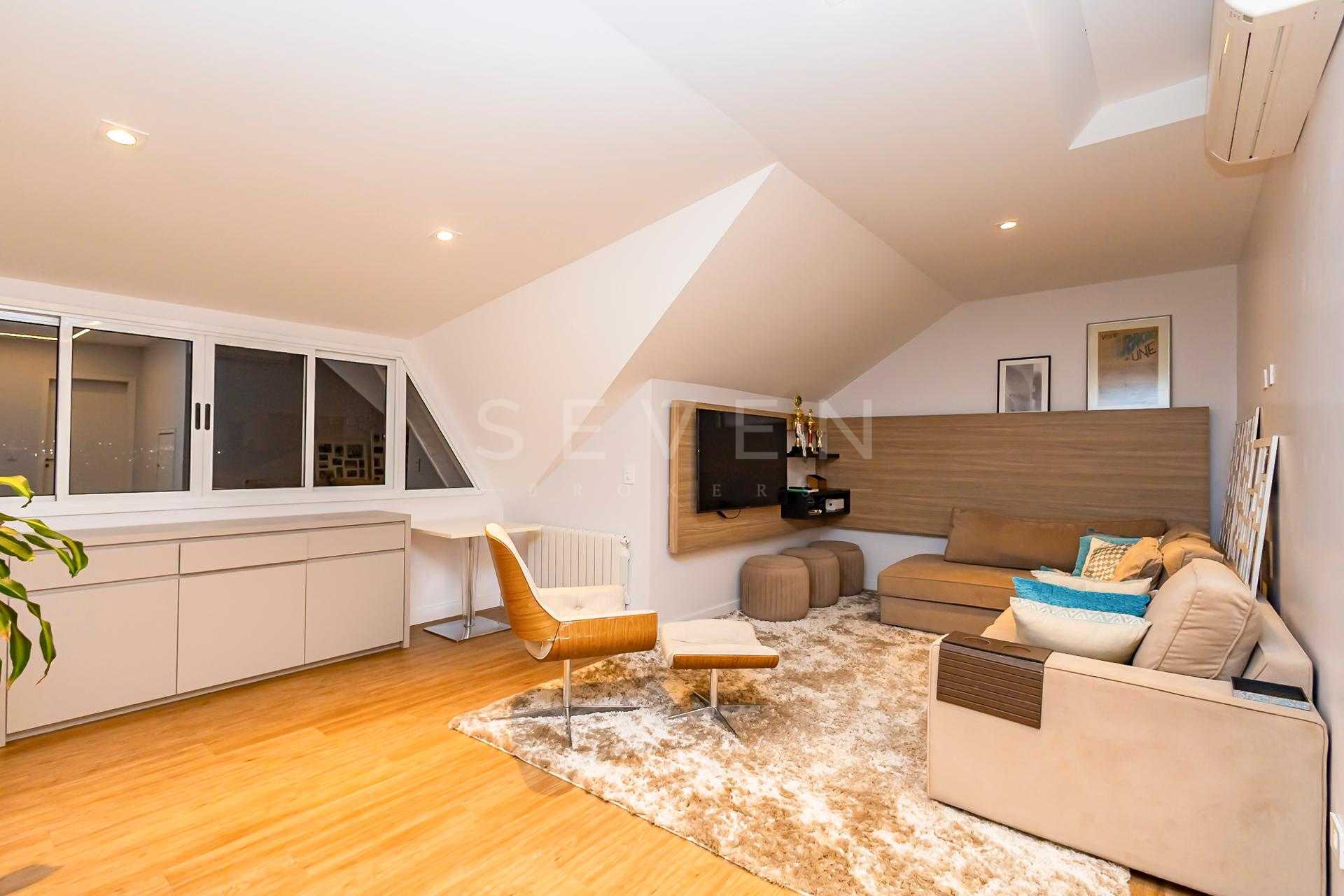 No piso superior, a área íntima conta com três suítes, incluindo a master com closet amplo e varanda privativa. Um estar íntimo com home theater e um ático versátil perfeito para escritório, sala de estudos ou até mesmo um quinto quarto complementam a planta, com um banheiro completo atendendo essa área.