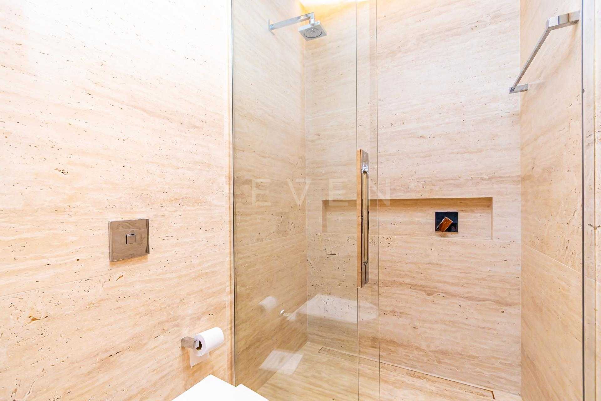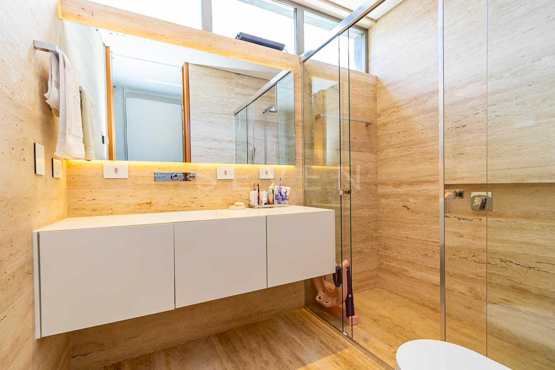 Travertino romano instalado em todo Piso, inclusive na garagem e banheiros, instalados pela ELF.