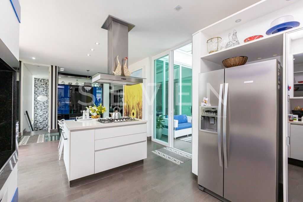- Cozinha moderna com ilha gourmet, churrasqueira e espaço para copa