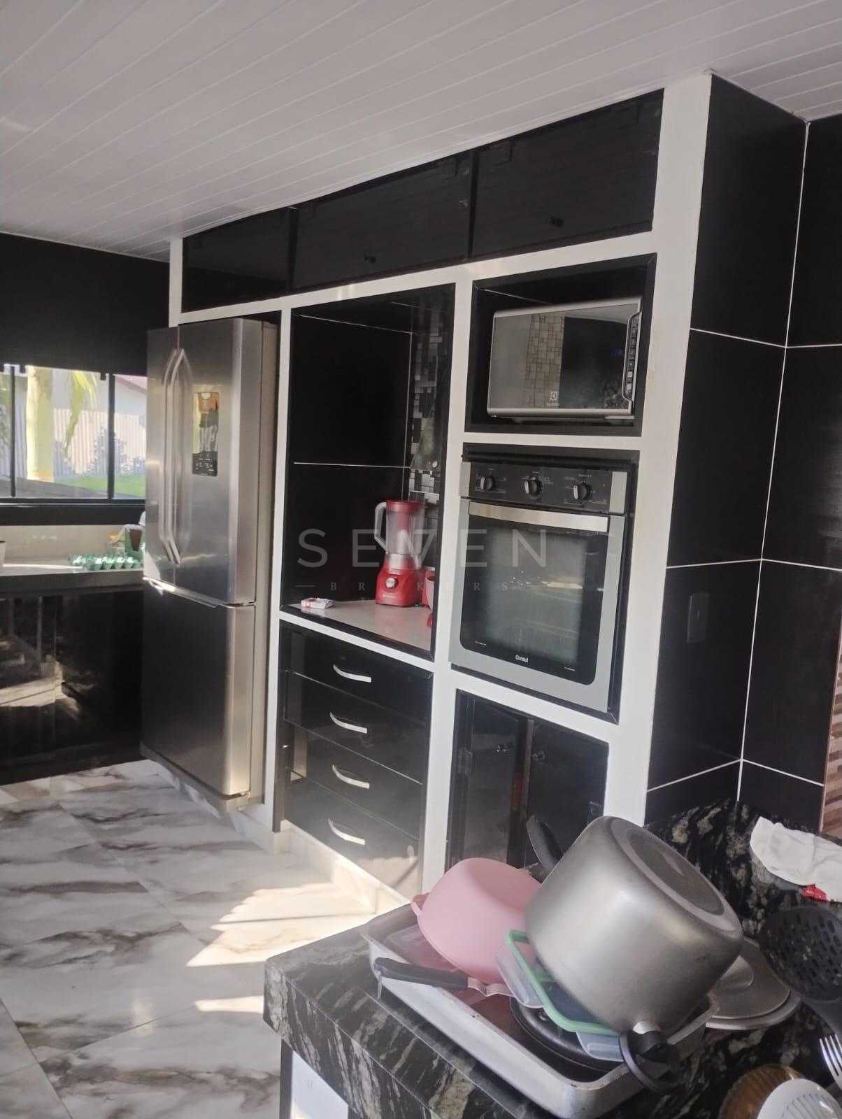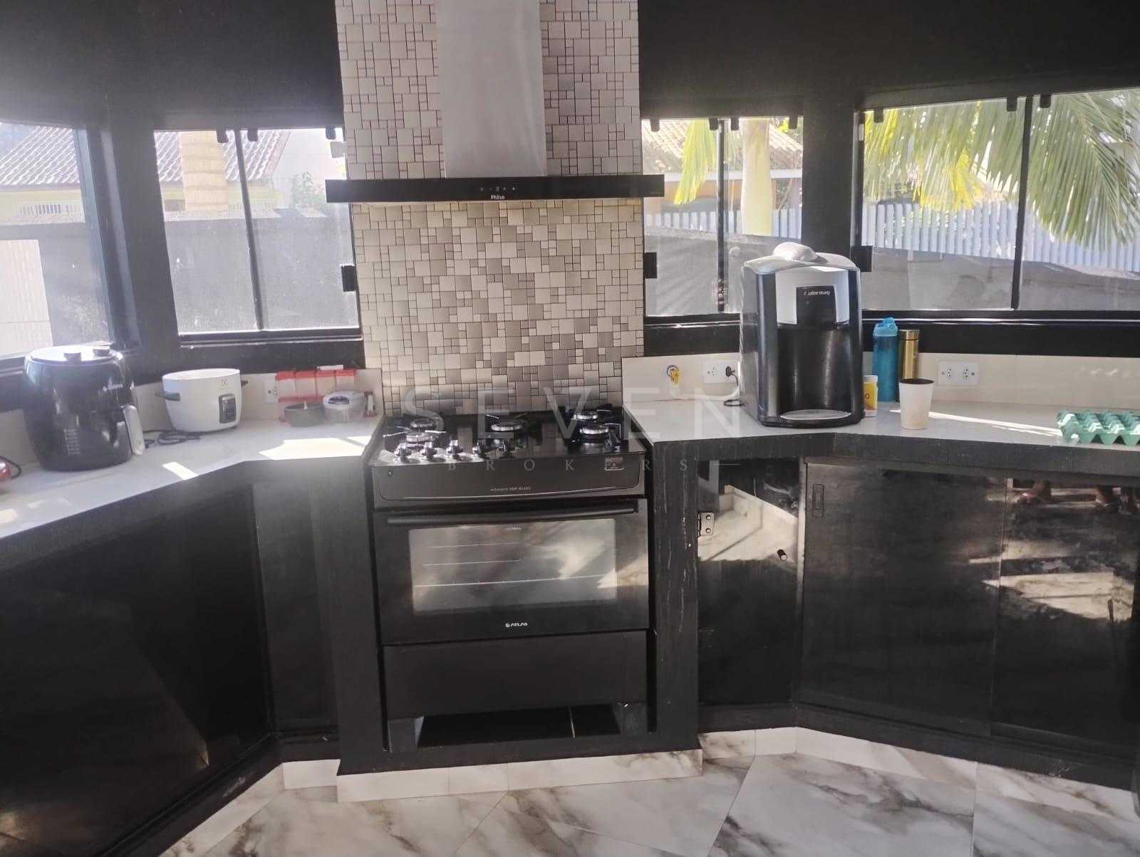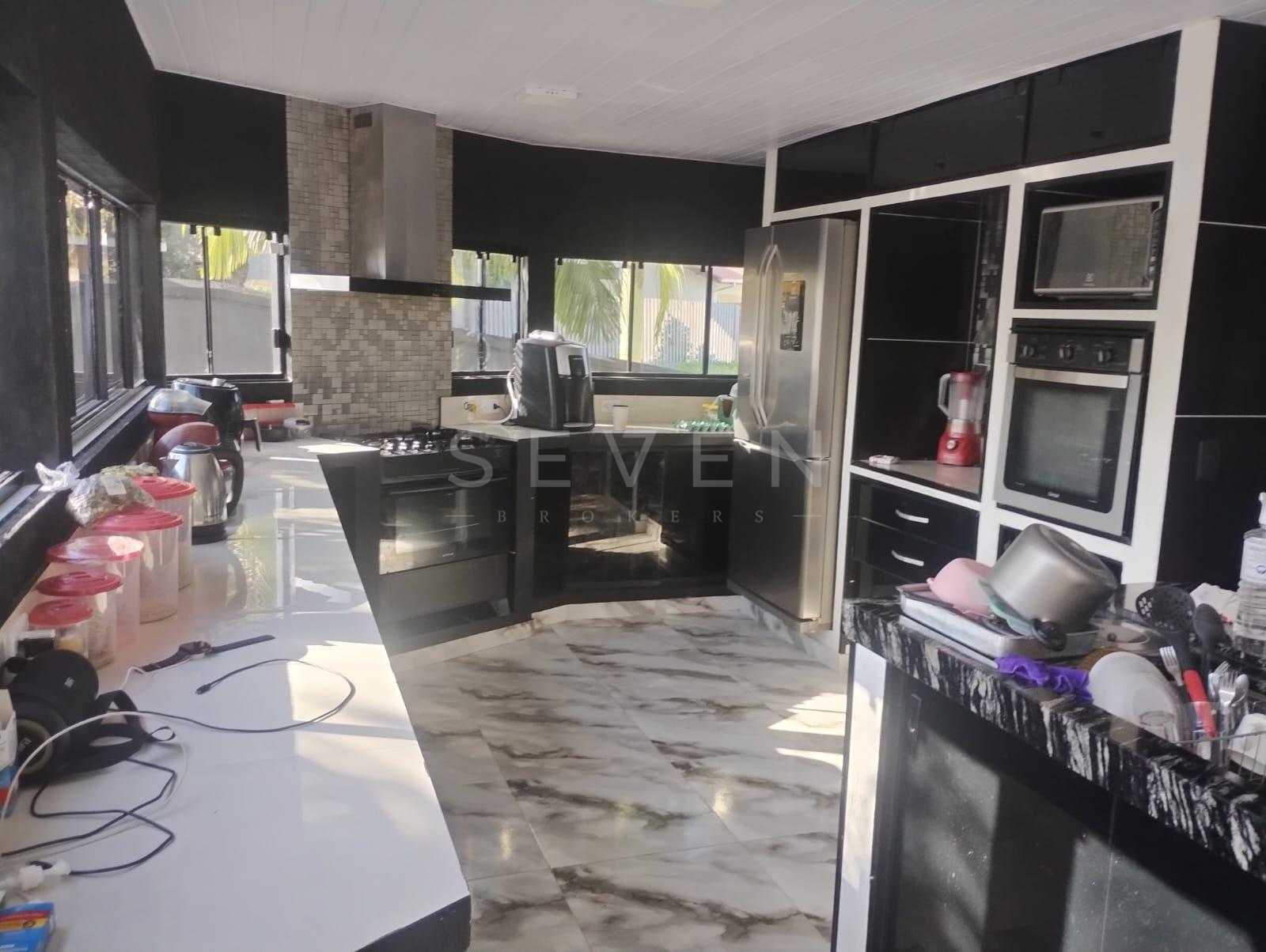 Cozinha conceito aberto: totalmente em alvenaria, com portas de vidro, ilha central com bancada de granito integrada ao espaço gourmet.