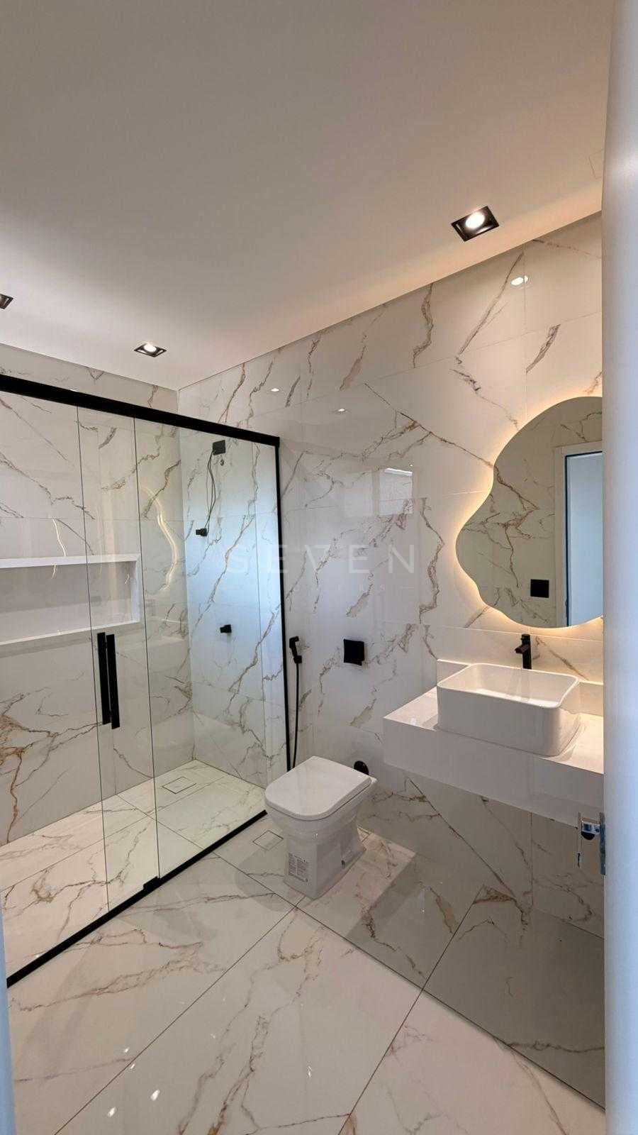 O banheiro da suíte possui pia esculpida em porcelanato, nicho iluminado em LED e box instalado, criando um espaço elegante e funcional.