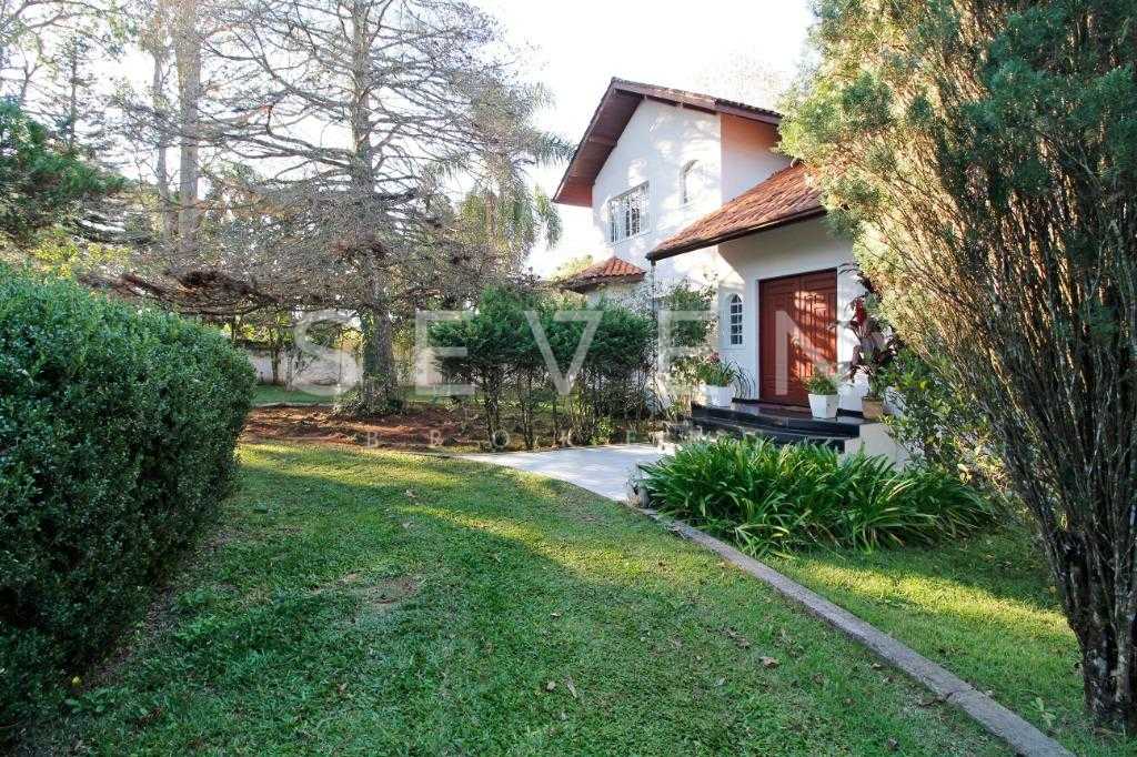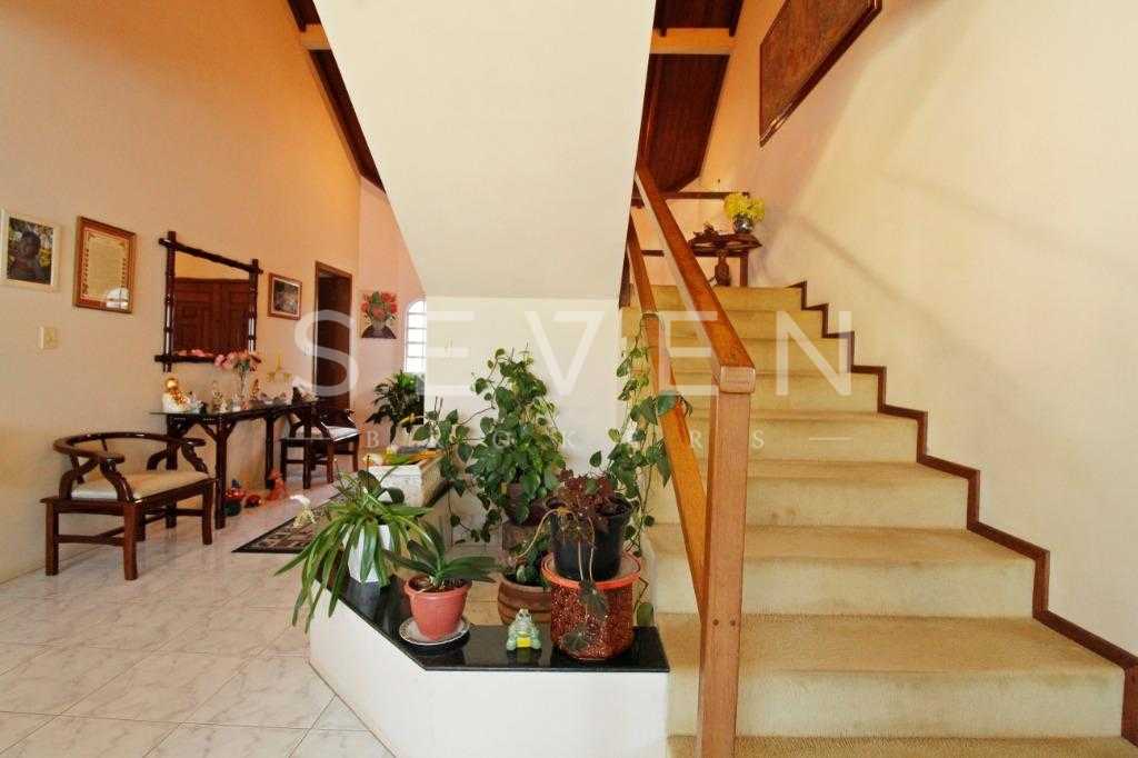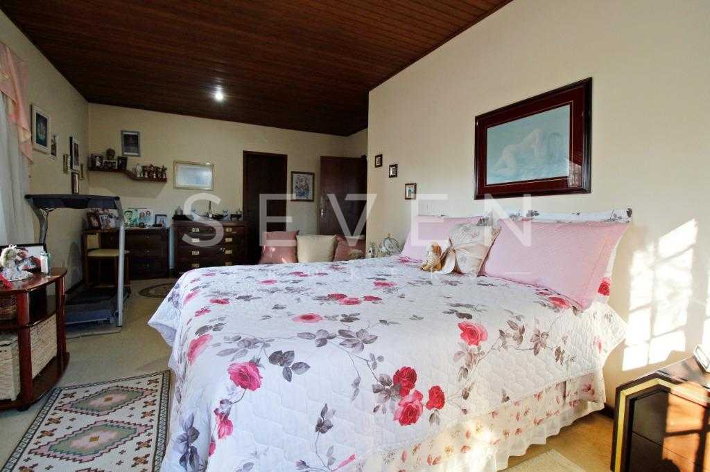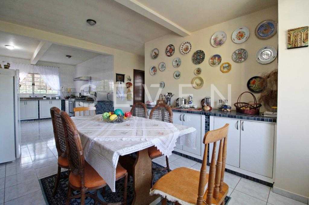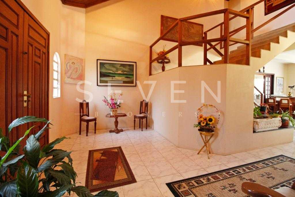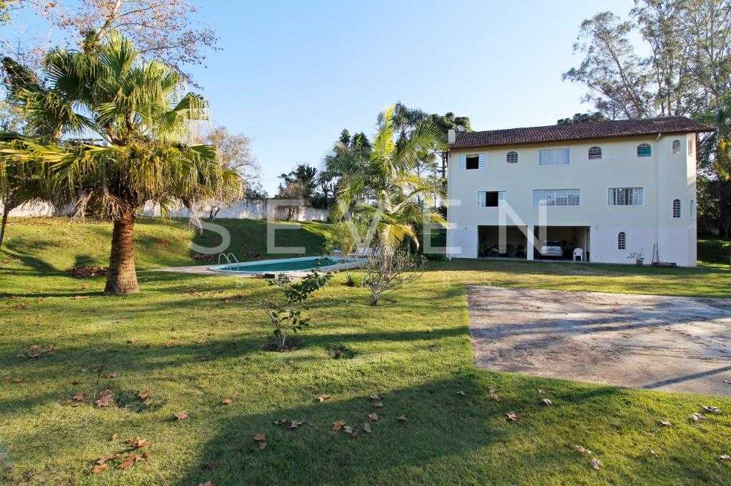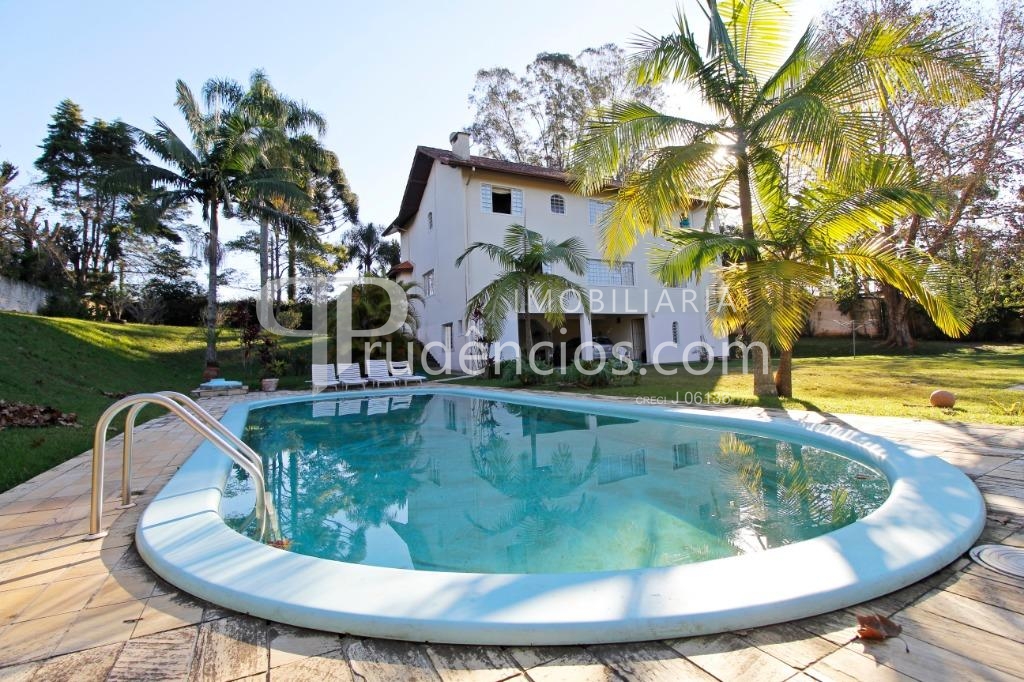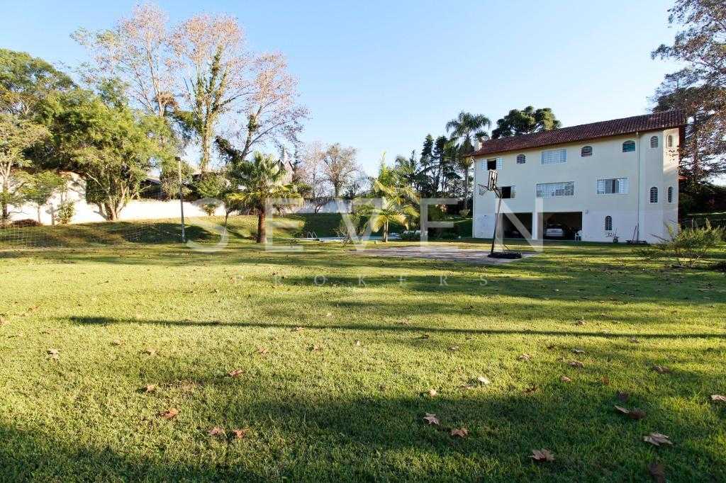 A casa tem aproximadamente 400 m2 e a construção tem 15 anos, sendo distribuída conforme segue.Piso térreo:- 1 Sala de jantar- 1 Sala de estar com lareira em granito- 1 sala de música- Hall de entrada- Escritório- Copa- Cozinha com armários embutidos- Despensa com armários- Lavabo com pia de granitoPiso superior:- 1 Suíte master com closet com armários embutidos,banheiro com box blindex,gabinete e banheira de hidromassagem - 1 Suíte com banheiro com box blindex e gabinete - 2 Quartos com closet com armários embutidos- Corredor com armário embutido- Banheiro social com gabinete e box blindexPiso inferior:- Lavanderia com aquecimento central a gás - Garagem- Quarto de emprega- Banheiro de empregadaTerreno:- 6000m2 todo murado, com portão de entrada eletrônico e interfone- Campo de futebol com iluminação- Mini quadra de basquete- Piscina 11X 4 X 1,5m , com iluminação interna e externaCanil- Bosque com árvores frutíferas e nativas de aprox.2000m2- Belo jardim frontal de aprox.1000m2- Poço com eletrificação para a casa- Porão para utensílios de jardim
