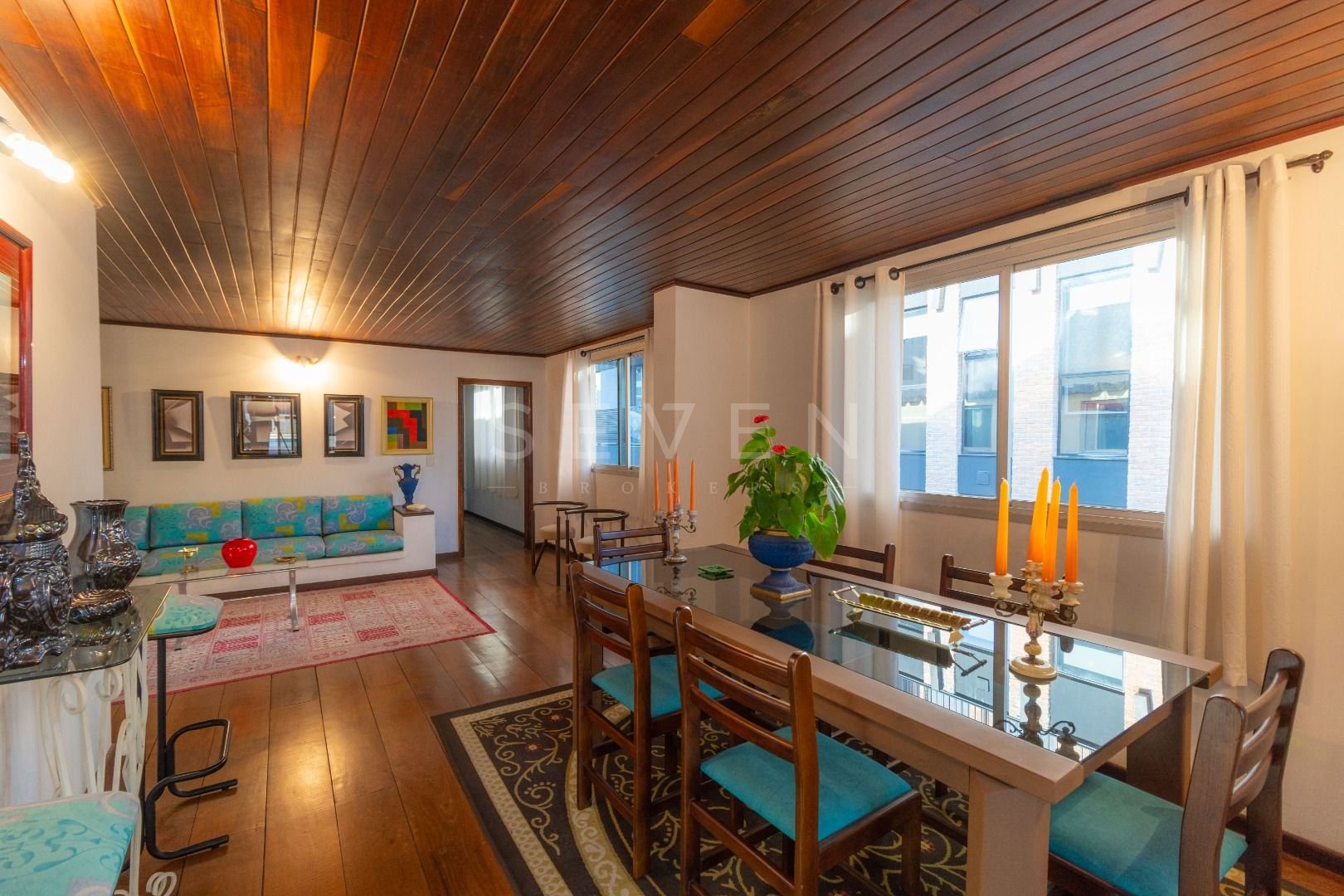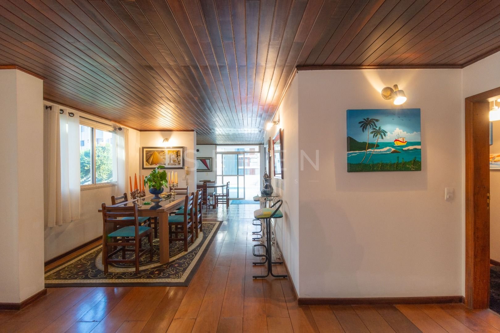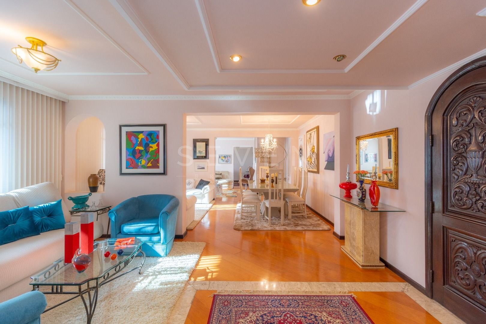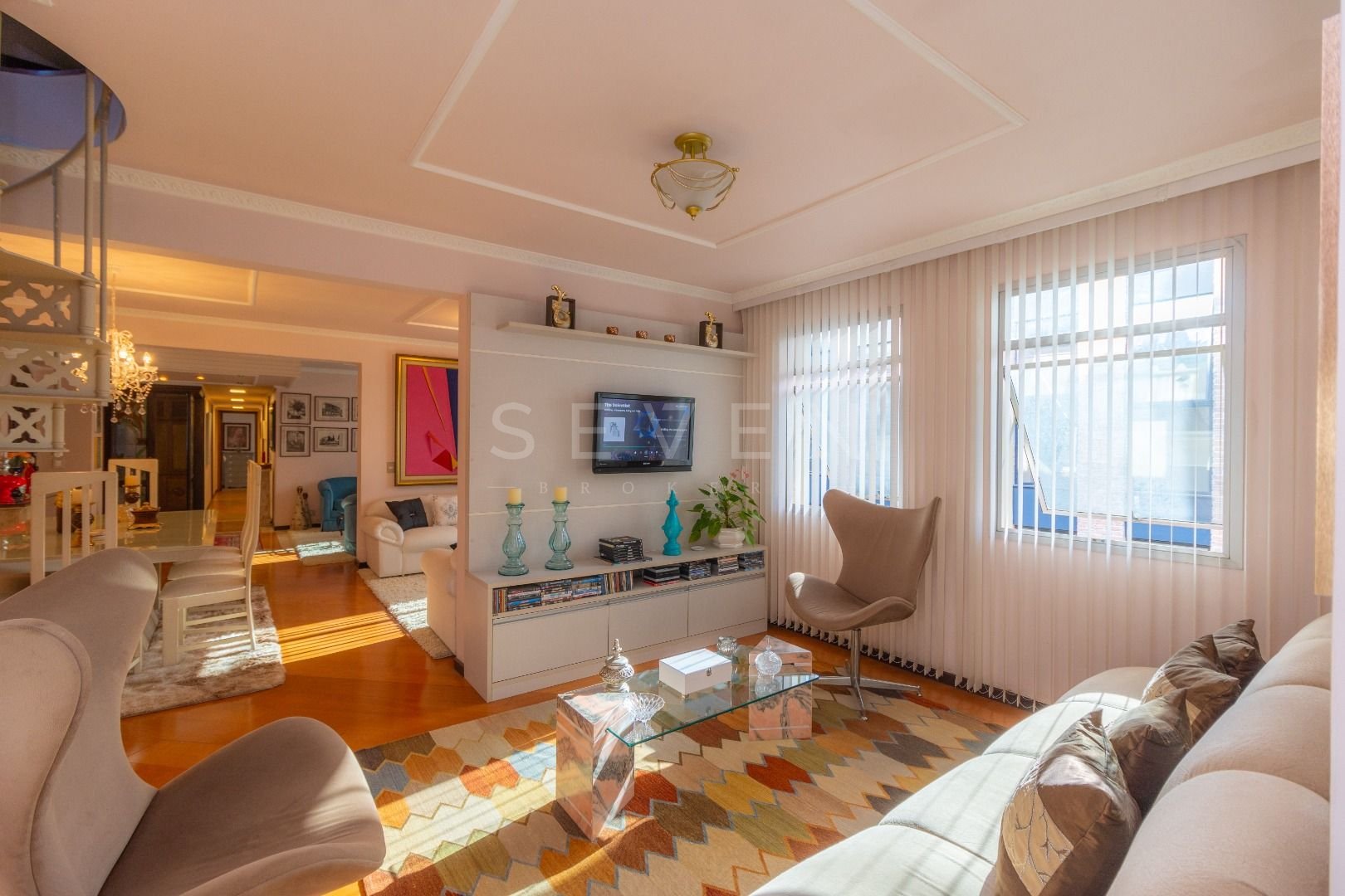 Quatro salas integradas: sala de estar, sala de TV, sala de jantar e copa ao lado da cozinha.