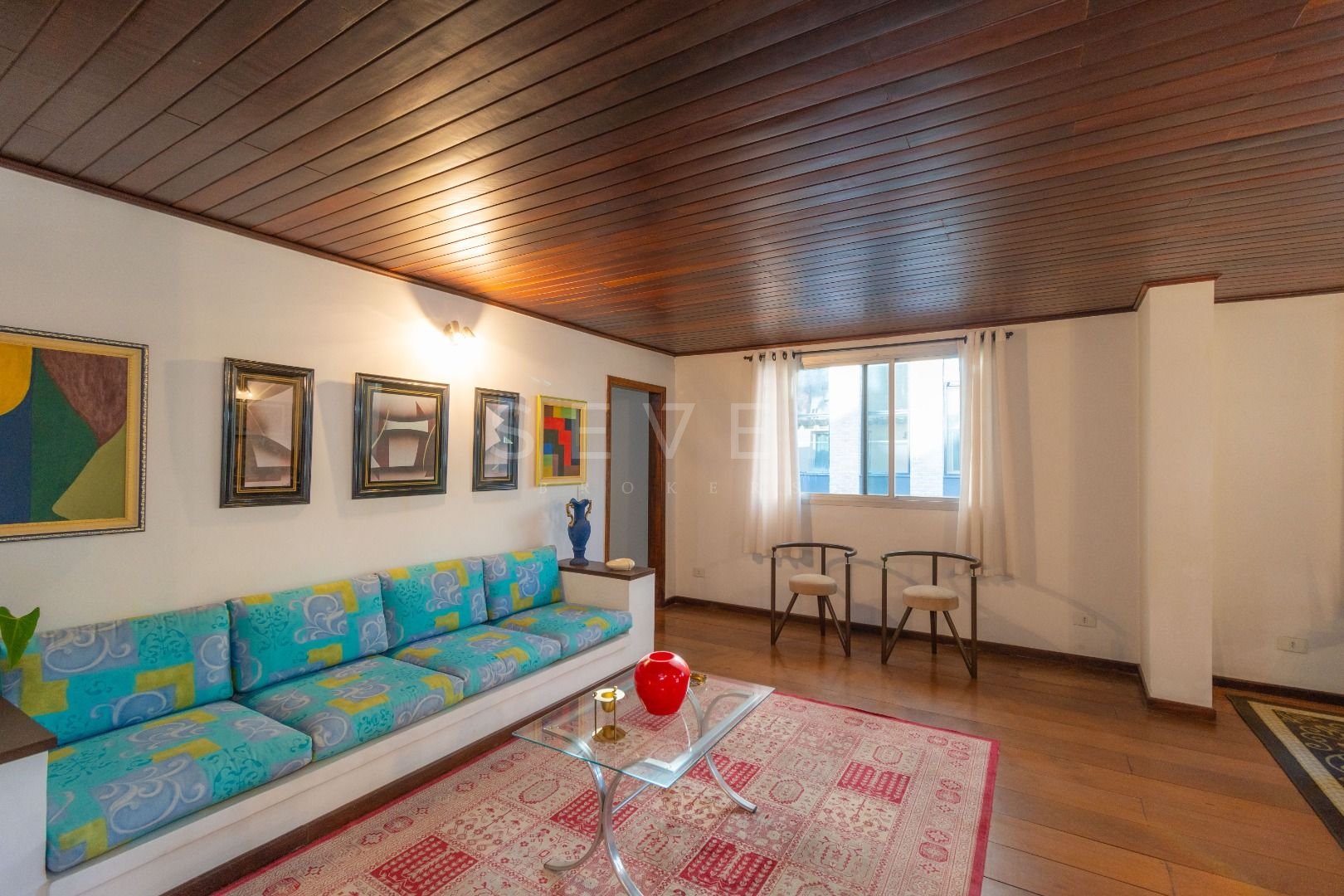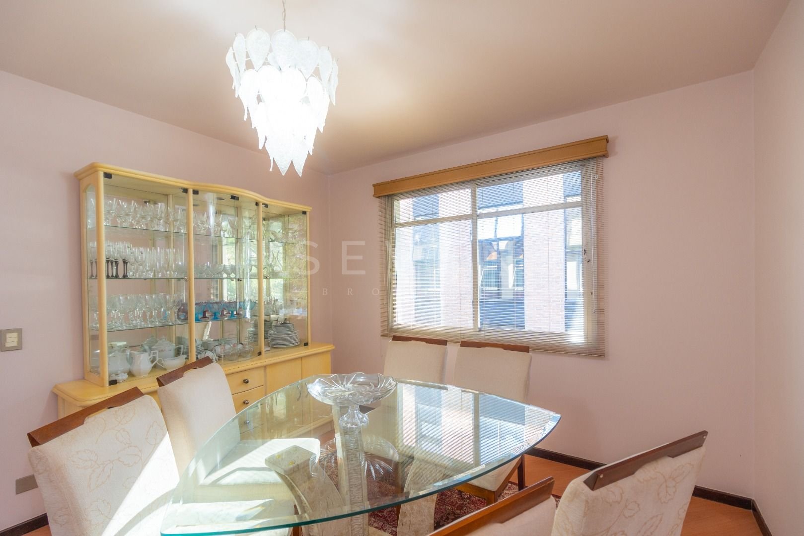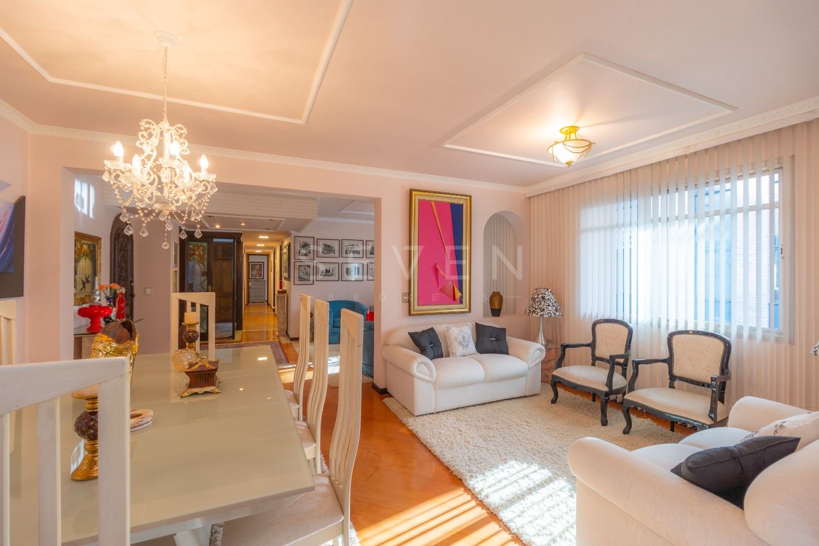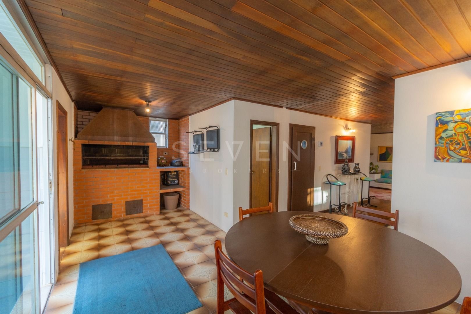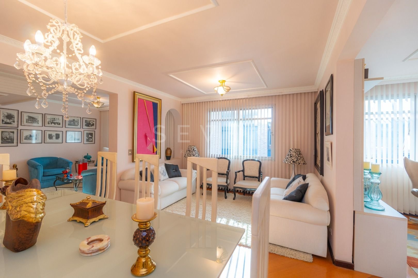 Quatro salas integradas: sala de estar, sala de TV, sala de jantar e copa ao lado da cozinha.