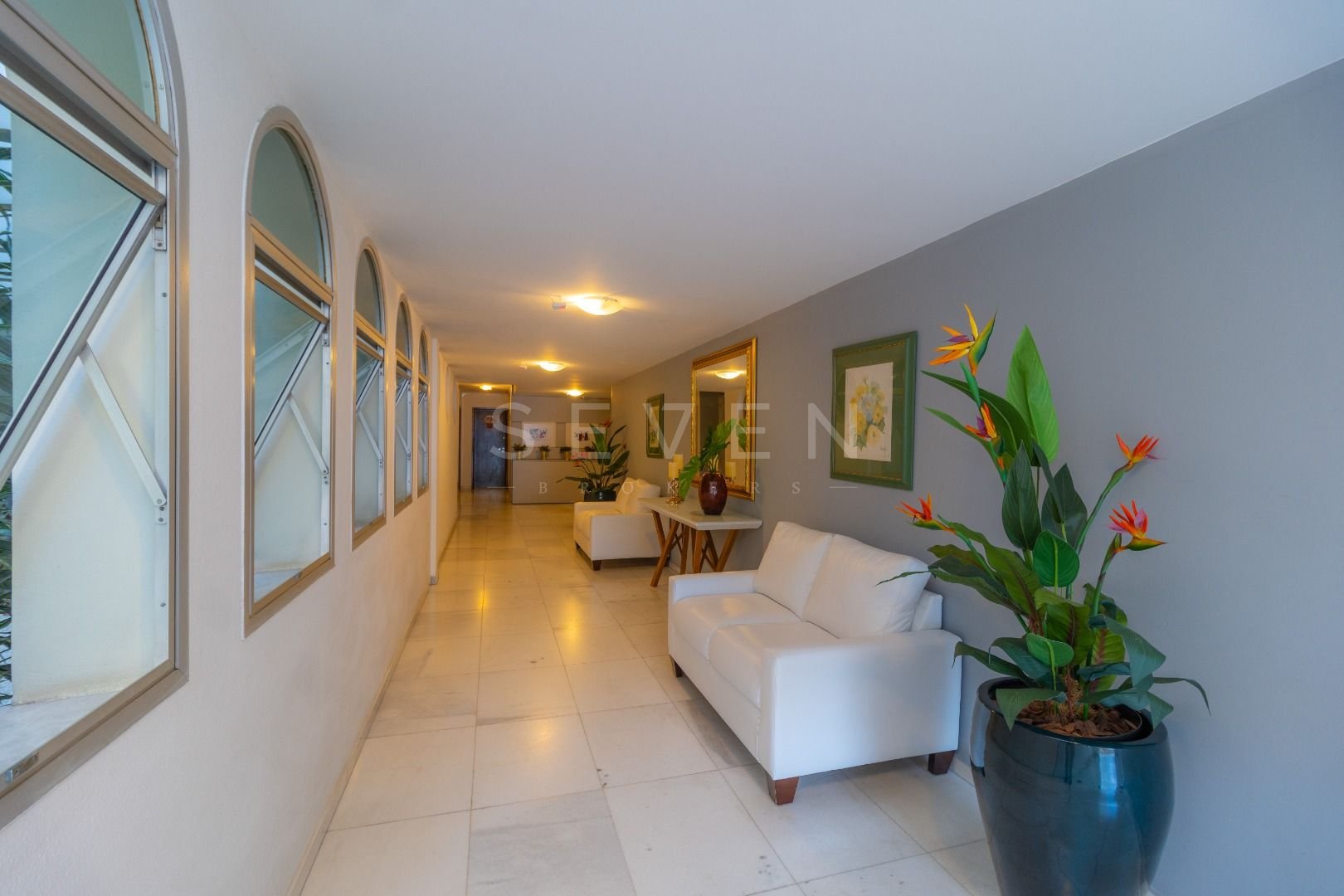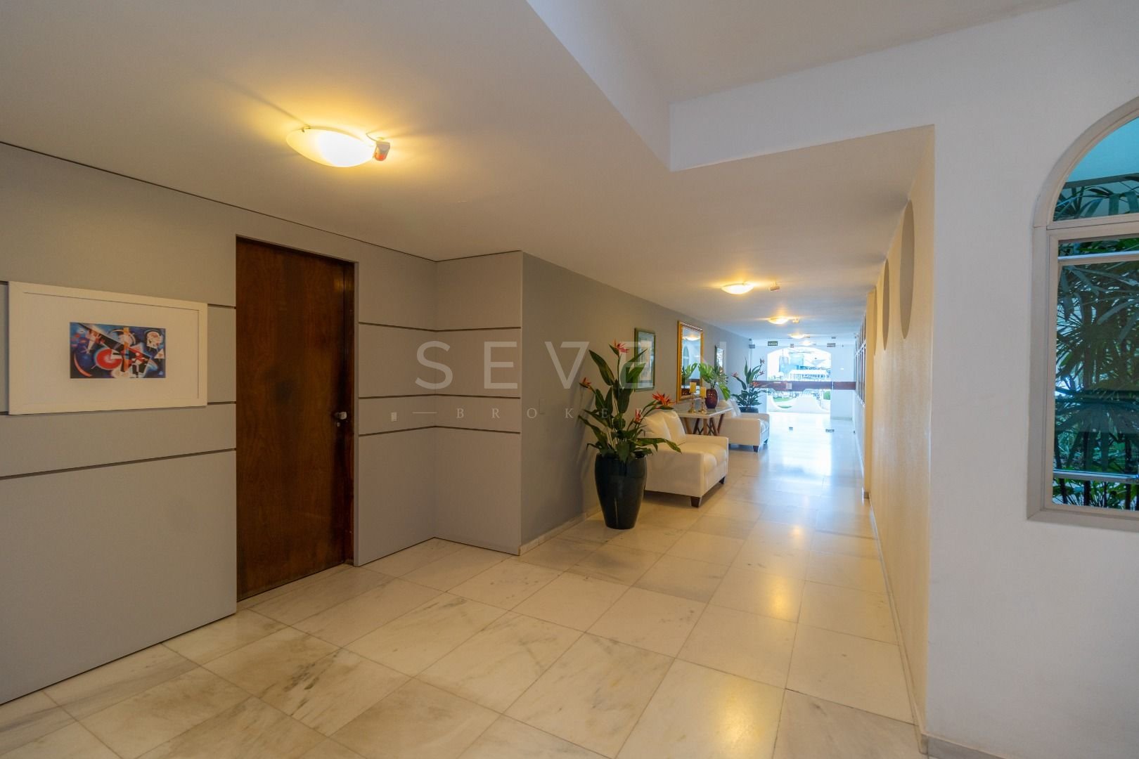 Salão de festas e jardim no piso térreo, com hall de entrada em mármore branco.