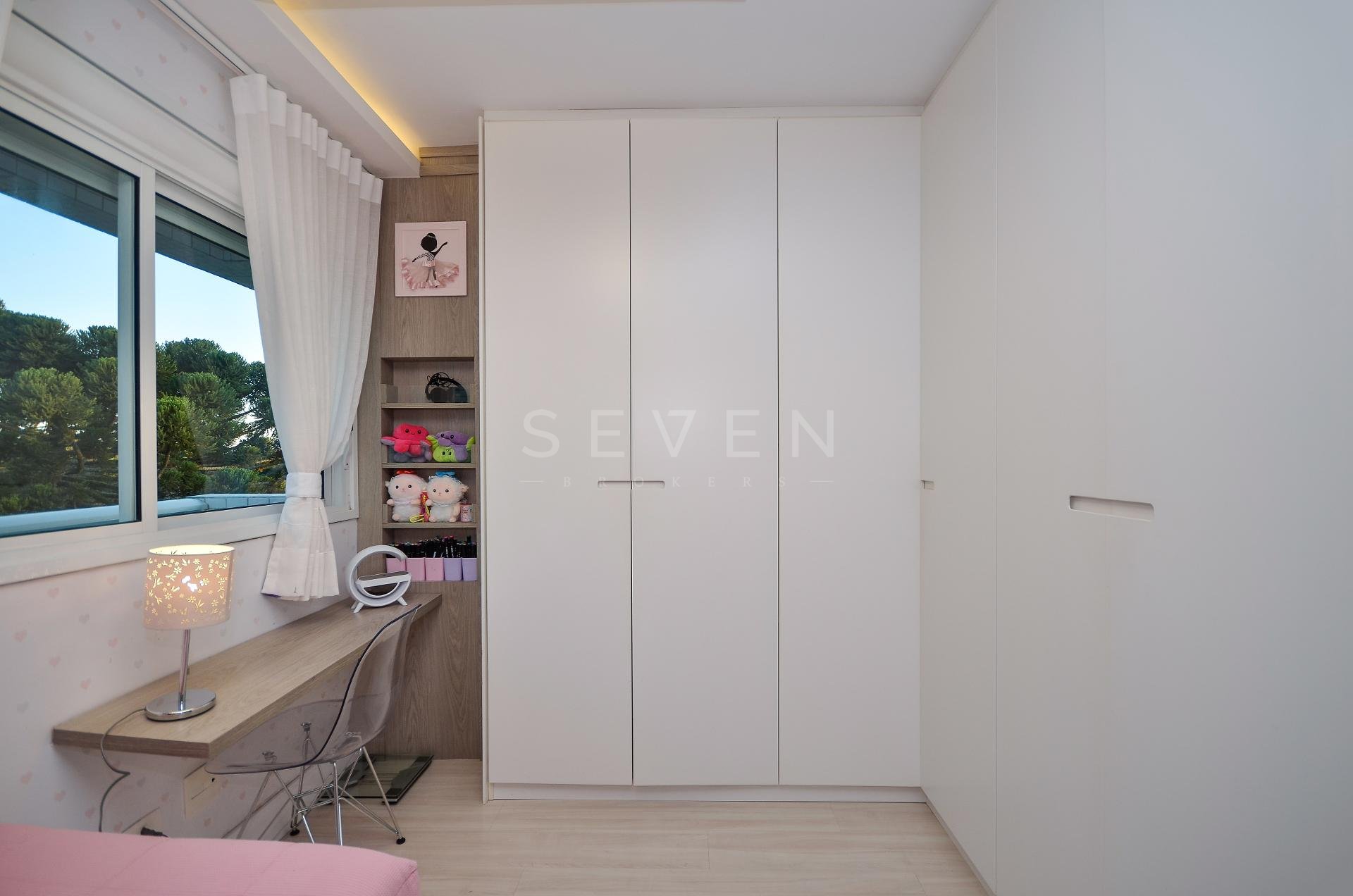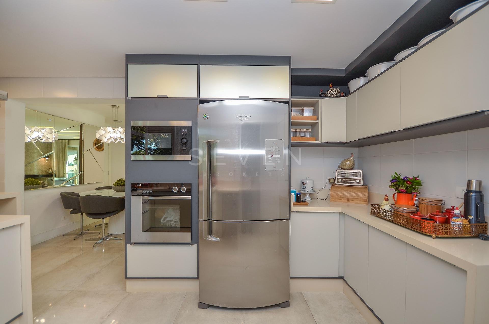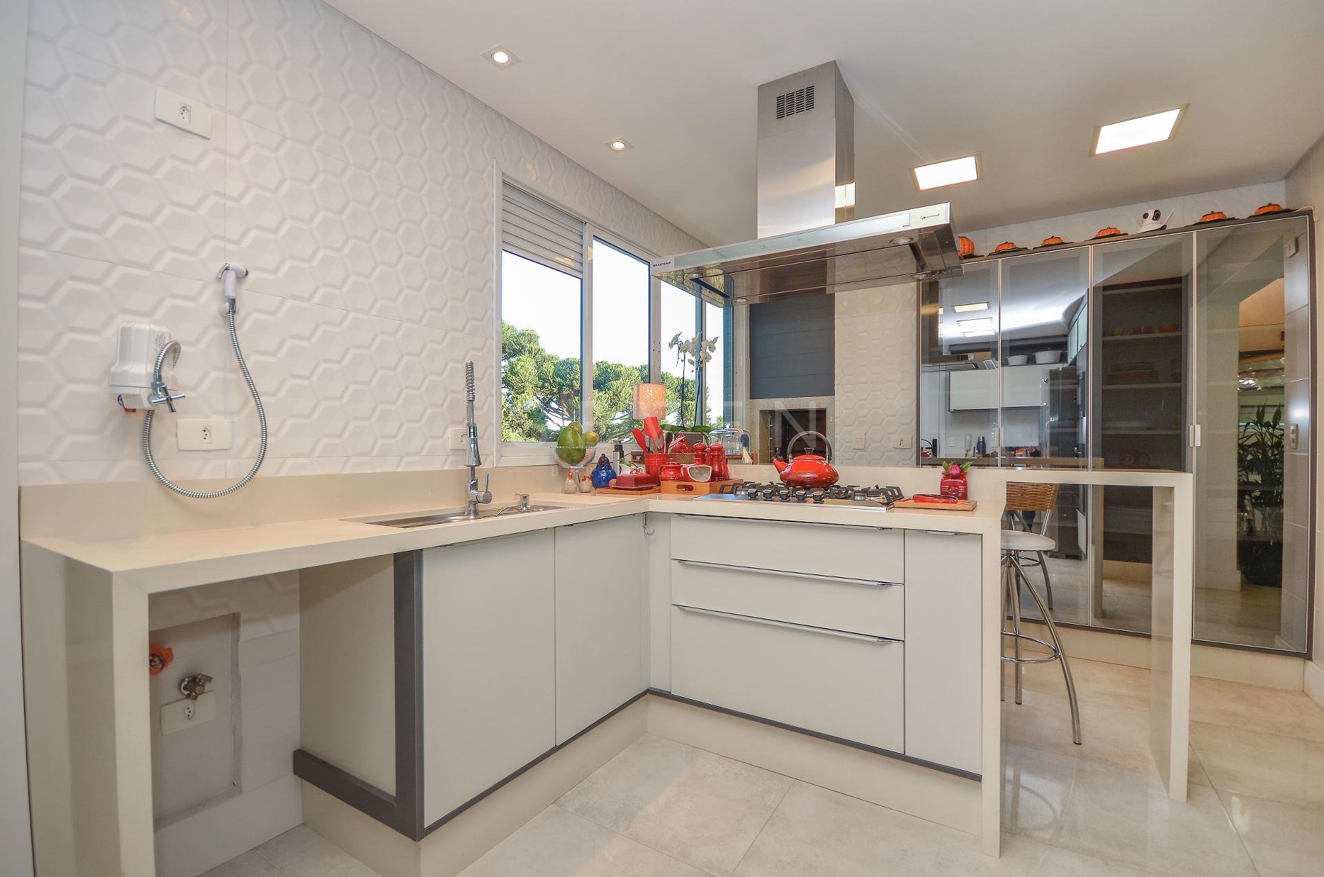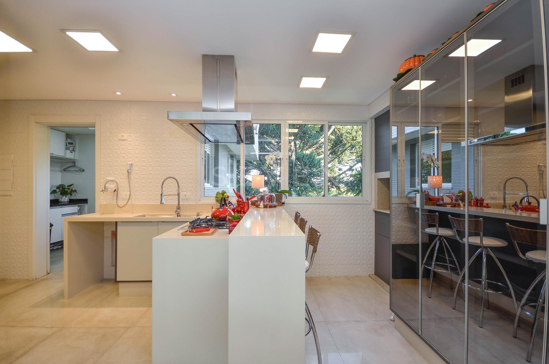 Sala de estar e jantar, lavabo, 3 quartos, sendo 1 suíte, guarda roupa com prateleiras de led, banheiro social, cozinha planejada, fogão à gás, churrasqueira, fica microondas e forno elétrico da Cata, área de serviço, escritório com banheiro, ar condicionado inverter em todos os quartos, fica cortinas, lustres e luminárias, todo o piso em porcelanato.