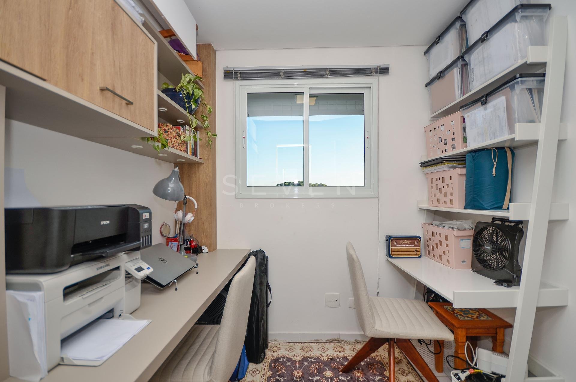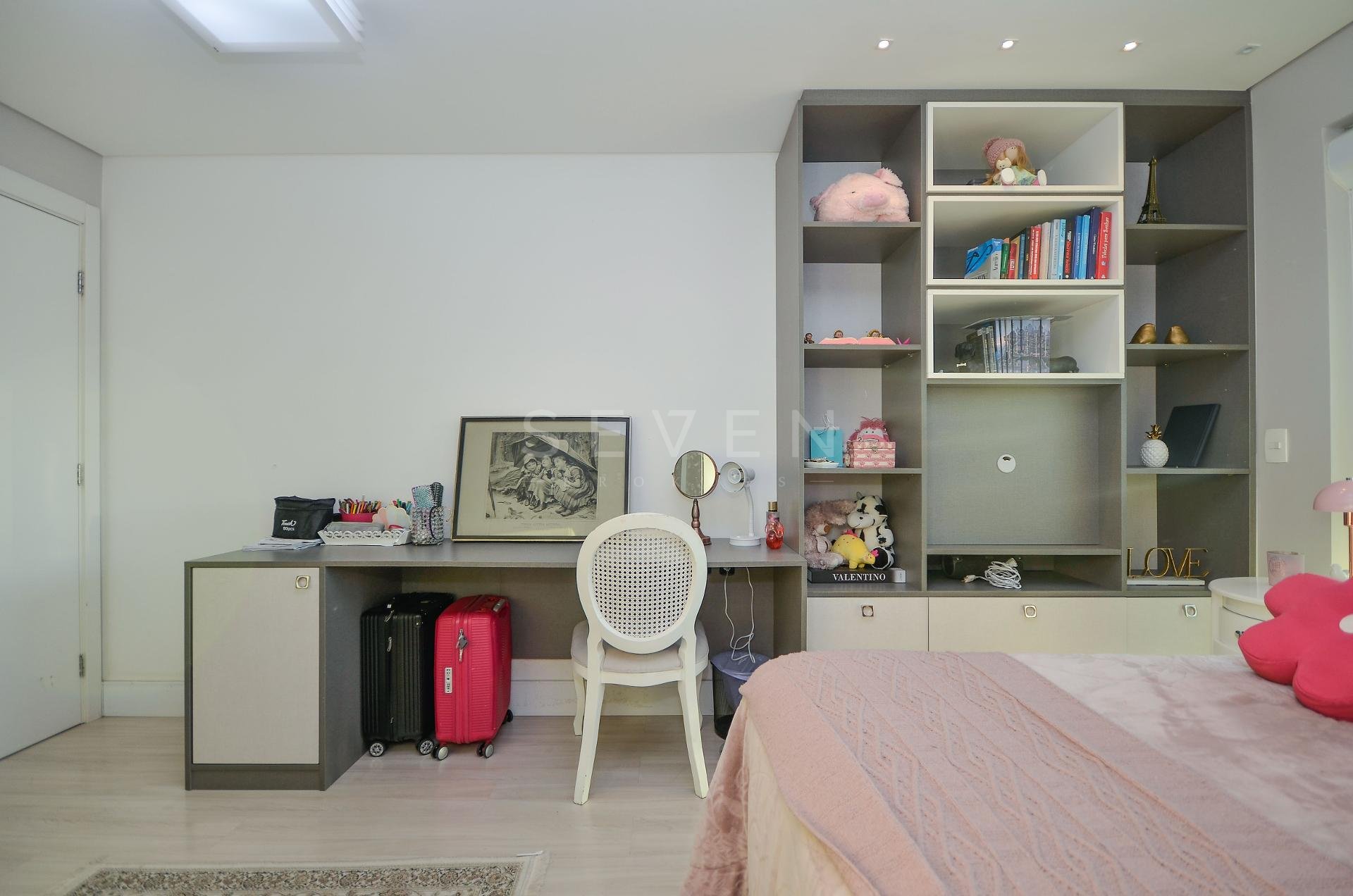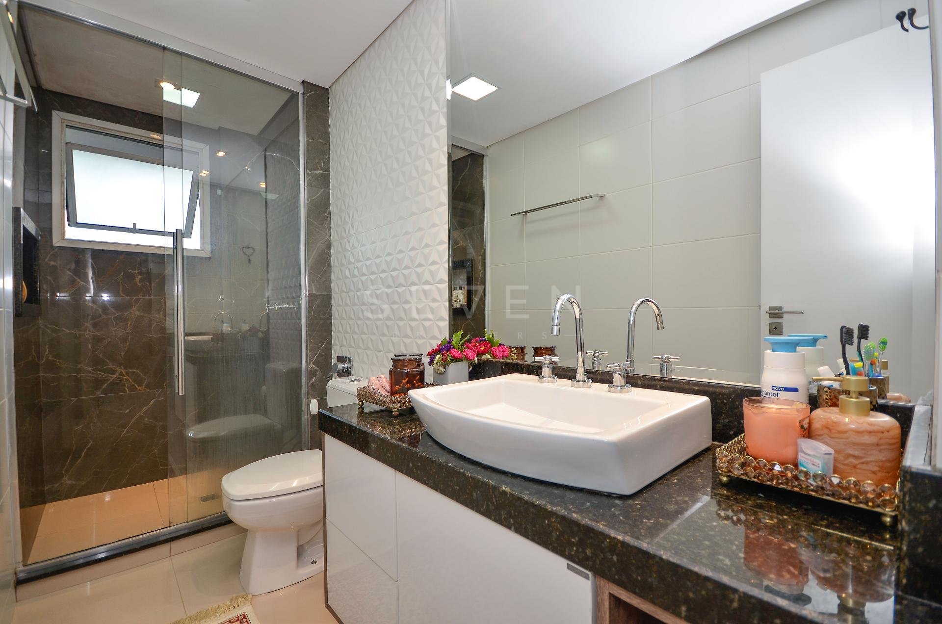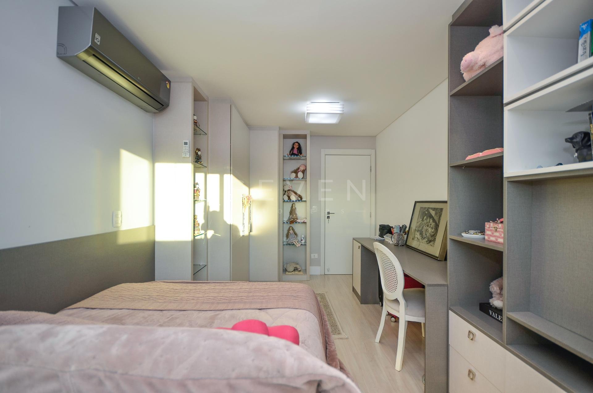 Sala de estar e jantar, lavabo, 3 quartos, sendo 1 suíte, guarda roupa com prateleiras de led, banheiro social, cozinha planejada, fogão à gás, churrasqueira, fica microondas e forno elétrico da Cata, área de serviço, escritório com banheiro, ar condicionado inverter em todos os quartos, fica cortinas, lustres e luminárias, todo o piso em porcelanato.