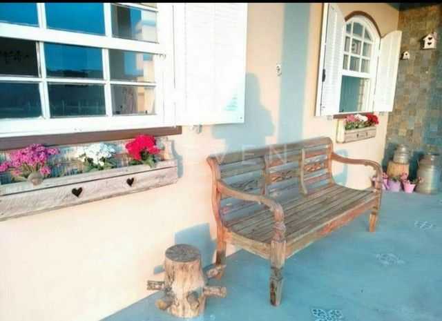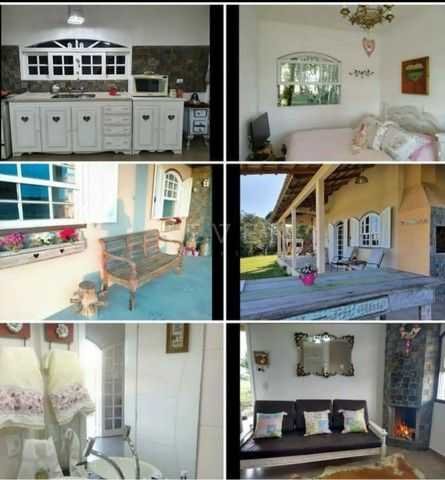 A casa principal, com 100 m², oferece conforto e aconchego: dois quartos espaçosos, sala ampla, cozinha integrada, lareira acolhedora e banheiro com jardim de inverno, proporcionando uma conexão única com a natureza.