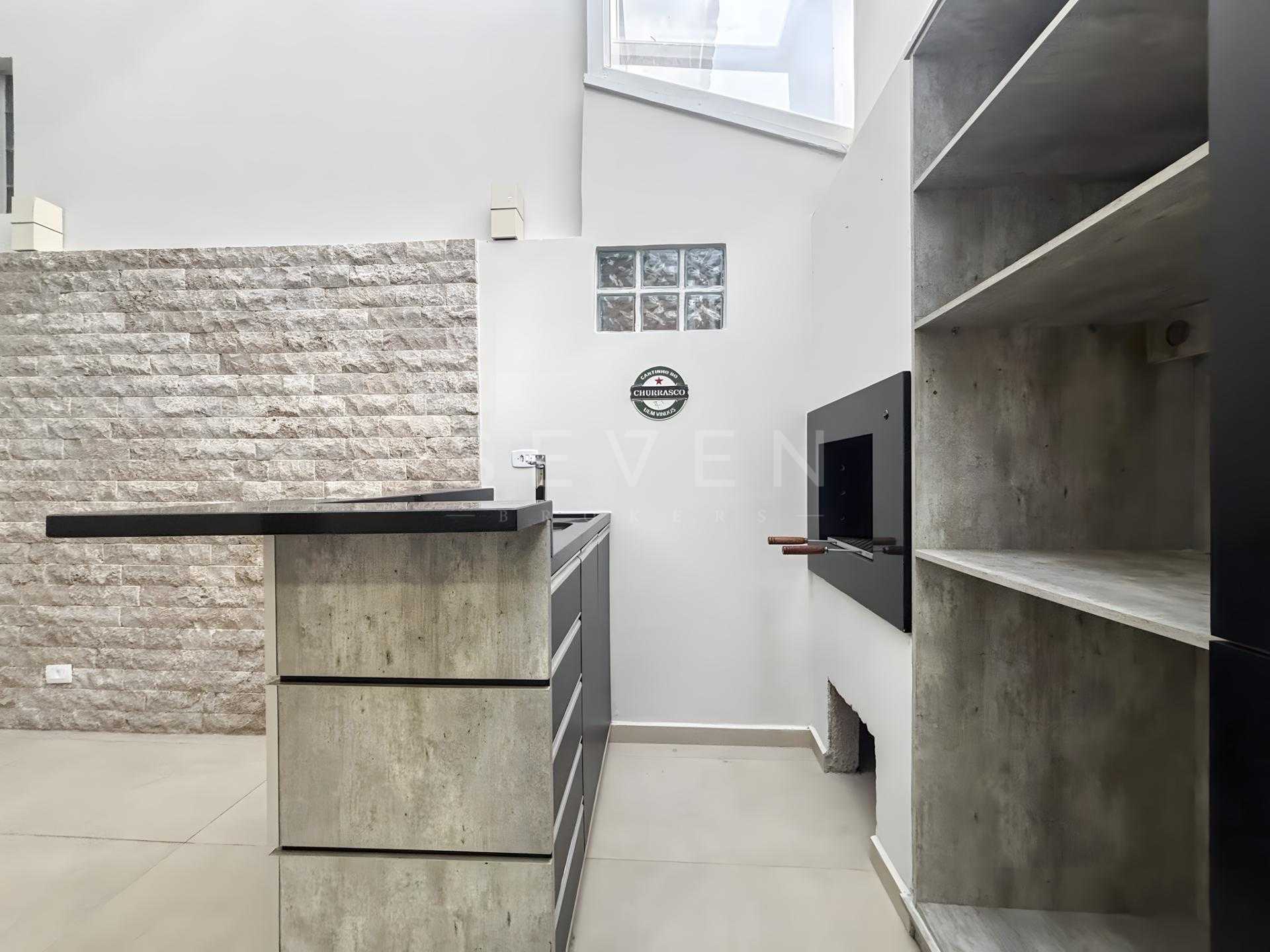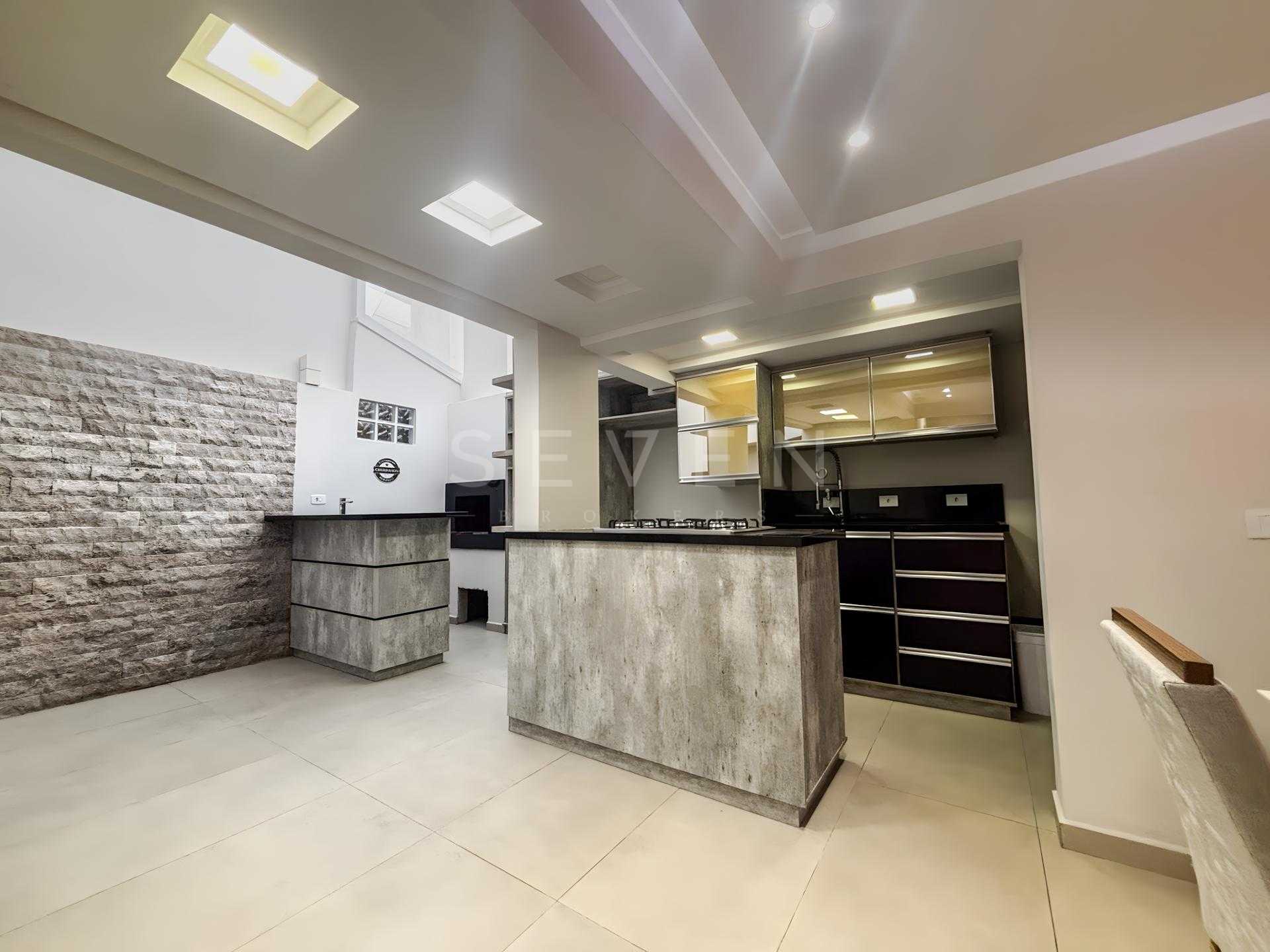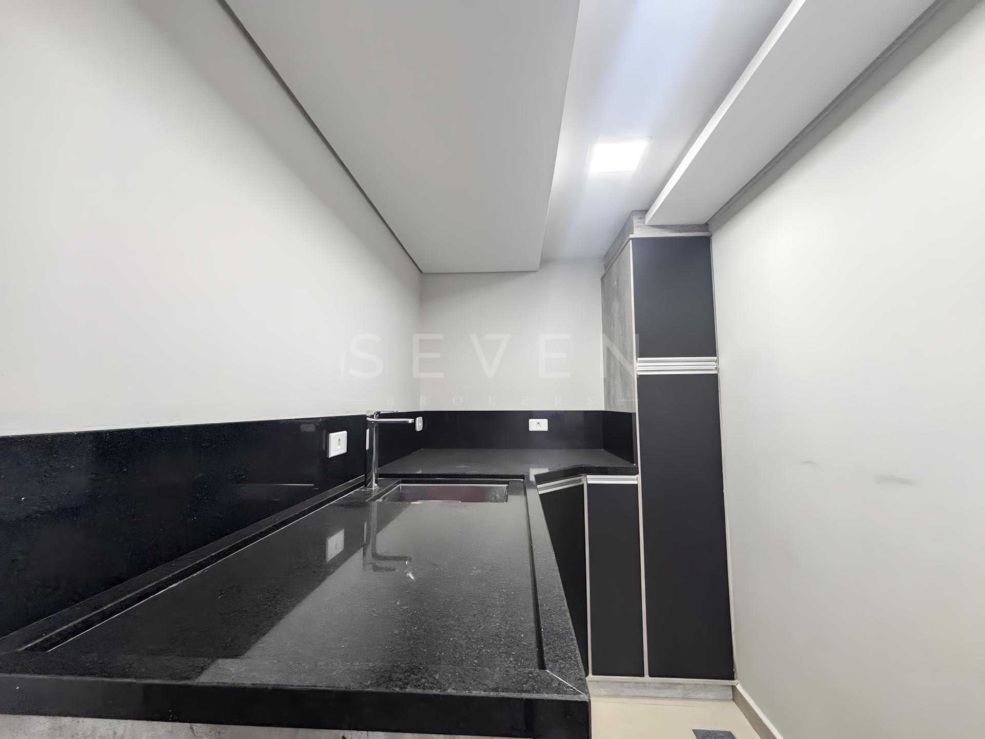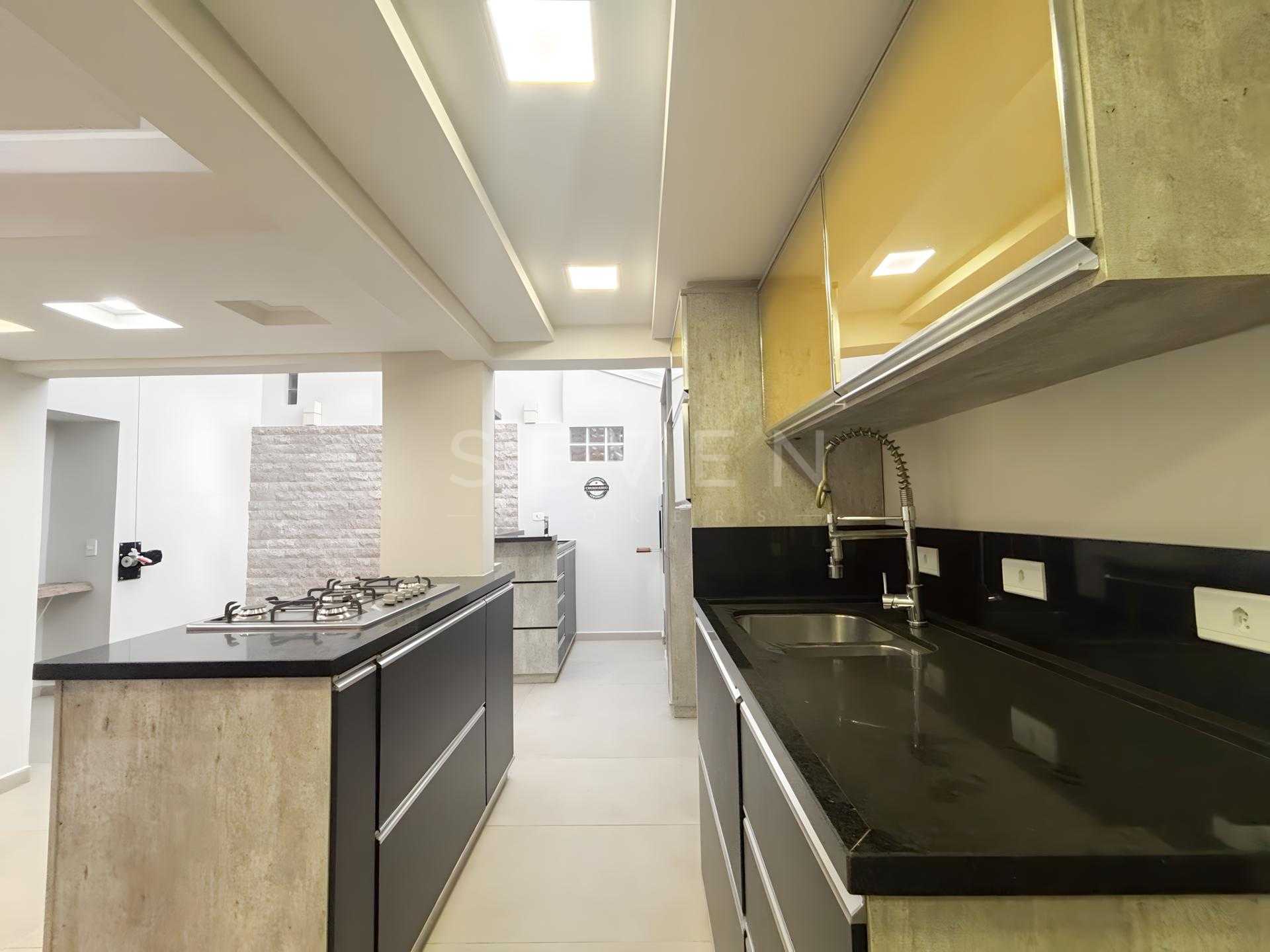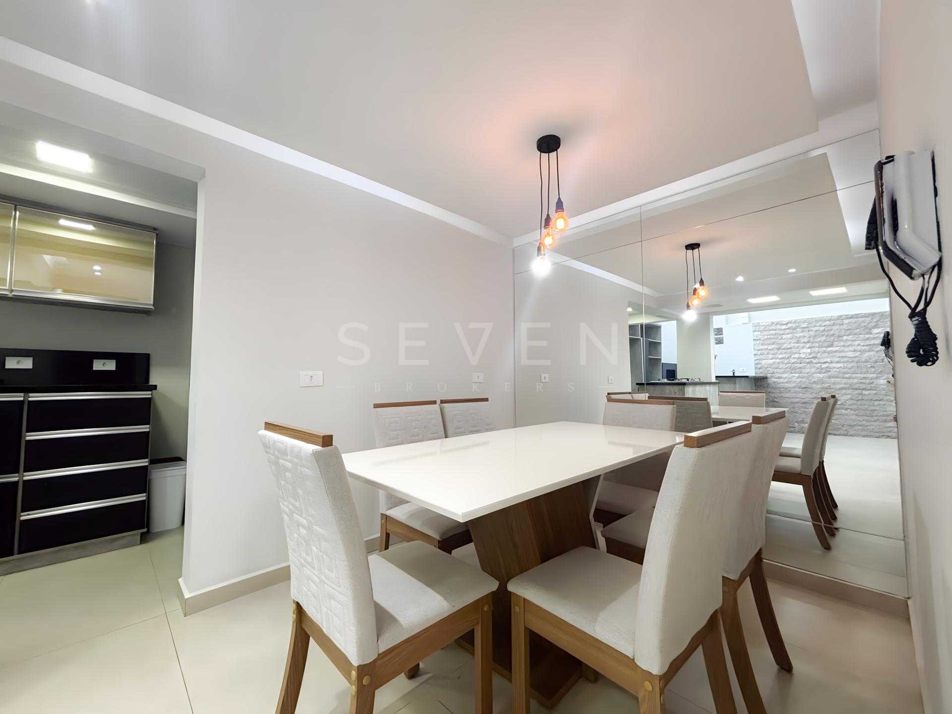 A cozinha planejada com acabamento moderno vem completa com armários embutidos, cooktop e mesa para 6 pessoas - perfeita para reunir a família. A sala de TV com lareira cria o ambiente ideal para momentos de convivência, já mobiliada com sofá de 4 lugares.
