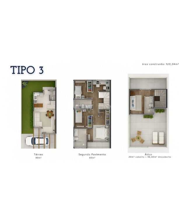 Sobrados 3 e 8 com 104m2 construídos, estão disponiveis por um valor menor mas não perdem na qualidade e conforto. Essas unidades dividem o acesso do condomínio com as uniades 9 e 10, de 120m2 construídos.