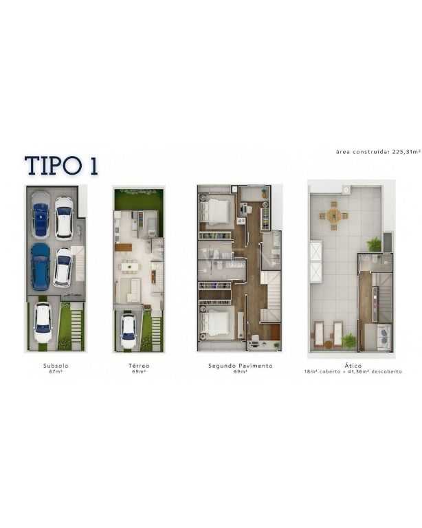 .O condomínio contem 3 tipos de plantas. Sobrados 1 a 4 com entrada privativa e garagem para 4 carros coberta.