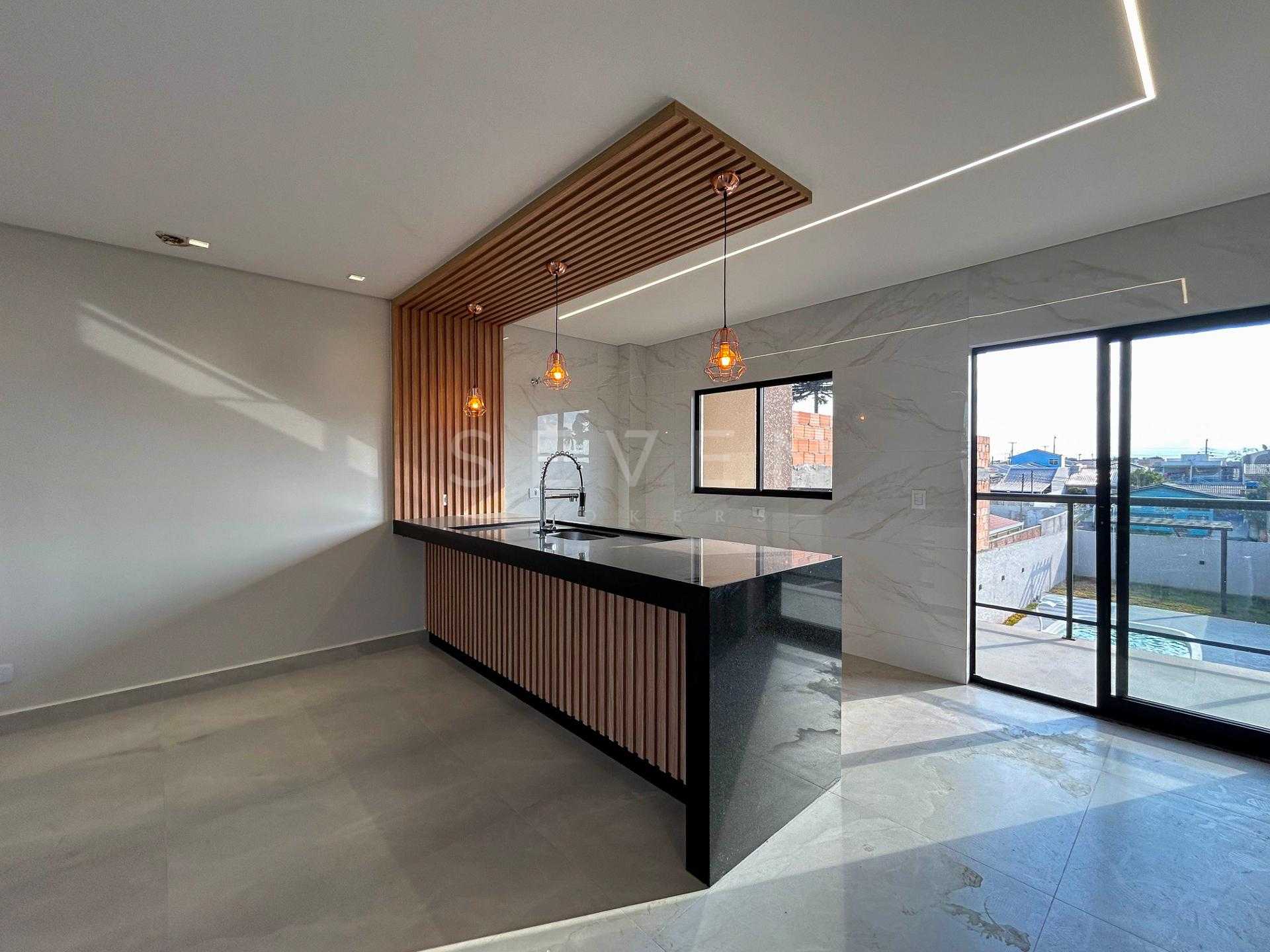 Sala e cozinha integradas com bancada