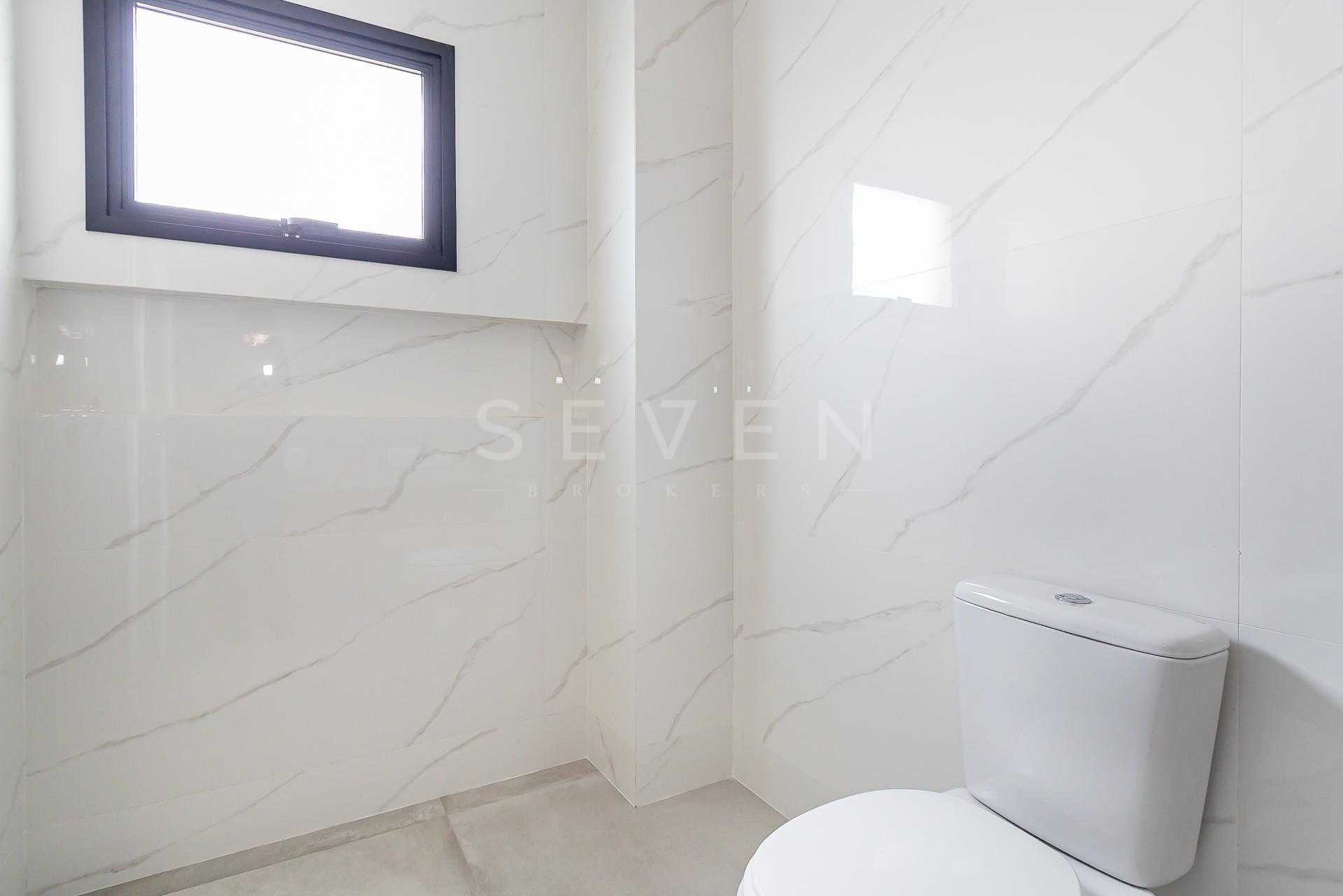 Banheiros modernos, lavabo no térreo e banheiros com cubas em mármore travertino, nichos e aquecimento a gás.