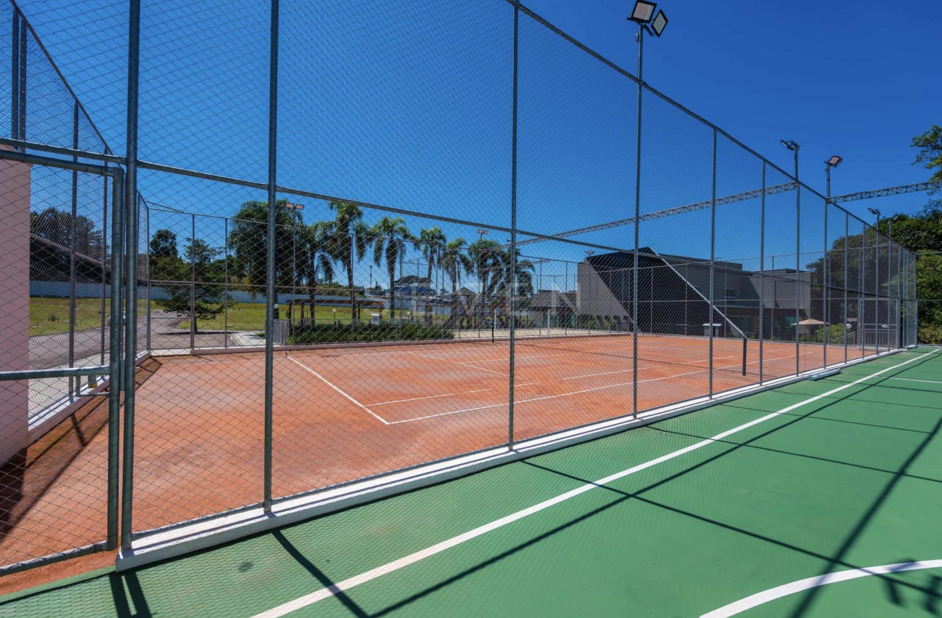 - Quadra de tênis em saibro com iluminação;
